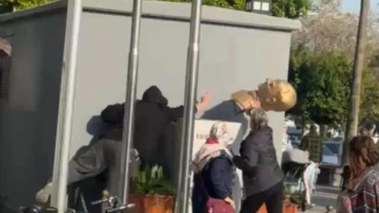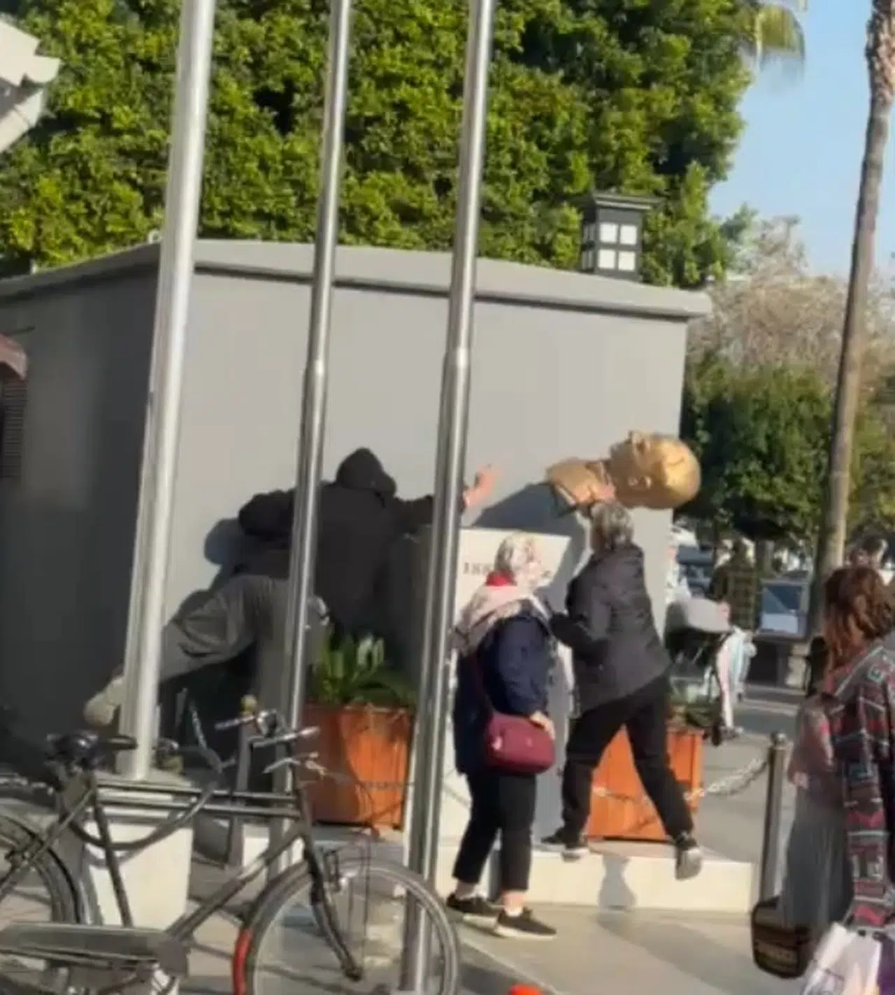 Olay, öğle saatlerinde merkez Akdeniz ilçesi Çankaya Mahallesi'nde meydana geldi. Muhtarlık binası önündeki Atatürk büstü, kimliği belirsiz kişi tarafından itilerek düşürüldü. Çevredekiler, şüpheliye tepki gösterip engel olmaya çalıştı. Yaşananlar, bir kişi tarafından cep telefonuyla görüntülendi. Saldırgan kişi, kendisine "Polise şikayet edeceğim seni" diyen bir kadına, "Ara polisi" dedikten sonra bölgeden uzaklaşırken, başka bir kişi ise büstü kaldırıp yerine koydu. (DHA)