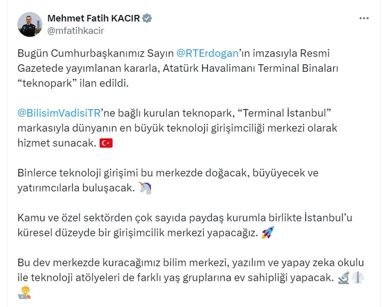 ANKARA, (DHA)- SANAYİ ve Teknoloji Bakanı Mehmet Fatih Kacır, Atatürk Havalimanı terminal binalarının 'teknopark' ilan edildiğini duyurarak, "Bilişim Vadisi'ne bağlı kurulan teknopark, 'Terminal İstanbul' markasıyla dünyanın en büyük teknoloji girişimciliği merkezi olarak hizmet sunacak" dedi.