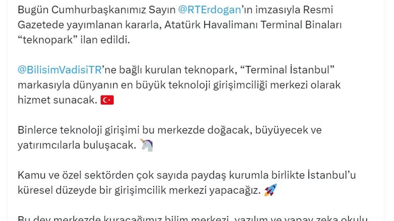 Bakan Kacır, sosyal medya hesabından yaptığı açıklamada, "Bugün Cumhurbaşkanımız Sayın Recep Tayyip Erdoğan'ın imzasıyla Resmi Gazetede yayımlanan kararla, Atatürk Havalimanı terminal binaları 'teknopark' ilan edildi. Bilişim Vadisi'ne bağlı kurulan teknopark, 'Terminal İstanbul' markasıyla dünyanın en büyük teknoloji girişimciliği merkezi olarak hizmet sunacak. Binlerce teknoloji girişimi bu merkezde doğacak, büyüyecek ve yatırımcılarla buluşacak. Kamu ve özel sektörden çok sayıda paydaş kurumla birlikte İstanbul'u küresel düzeyde bir girişimcilik merkezi yapacağız. Bu dev merkezde kuracağımız bilim merkezi, yazılım ve yapay zeka okulu ile teknoloji atölyeleri de farklı yaş gruplarına ev sahipliği yapacak" dedi. (DHA)