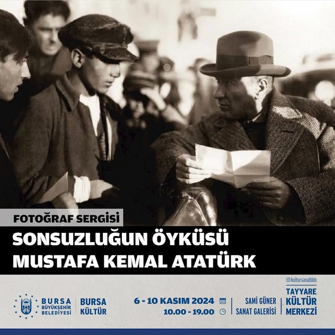 Bursa Büyükşehir Belediyesi’nce, Ulu Önder Mustafa Kemal Atatürk’ün vefatının 86’ncı yıl dönümünde, 10 Kasım Atatürk'ü Anma Haftası kapsamında hazırlanan ‘Sonsuzluğun Öyküsü-Mustafa Kemal Atatürk’ fotoğraf sergisi, 6-10 Kasım tarihlerinde, 10.00-19.00 saatleri arasında Tayyare Kültür Merkezi Sami Güner Sanat Galerisi'nde ziyaret edilebilecek. Ayrıca Orkestra Şube Müdürlüğü tarafından, 10 Kasım Pazar günü saat 20.30’da Tayyare Kültür Merkezi’nde ‘Ölümsüzlüğe Ezgiler-Bir Fırtına Tuttu Bizi’, 11 Kasım Pazartesi günü saat 20.00’da ise ‘Fikrimin İnce Gülü’ adlı konser düzenlenecek. Atatürk’ün sevdiği şarkılar ve türkülerin seslendirileceği gecede, Melihat Gülses ve Nida Ateş sahne alacak.