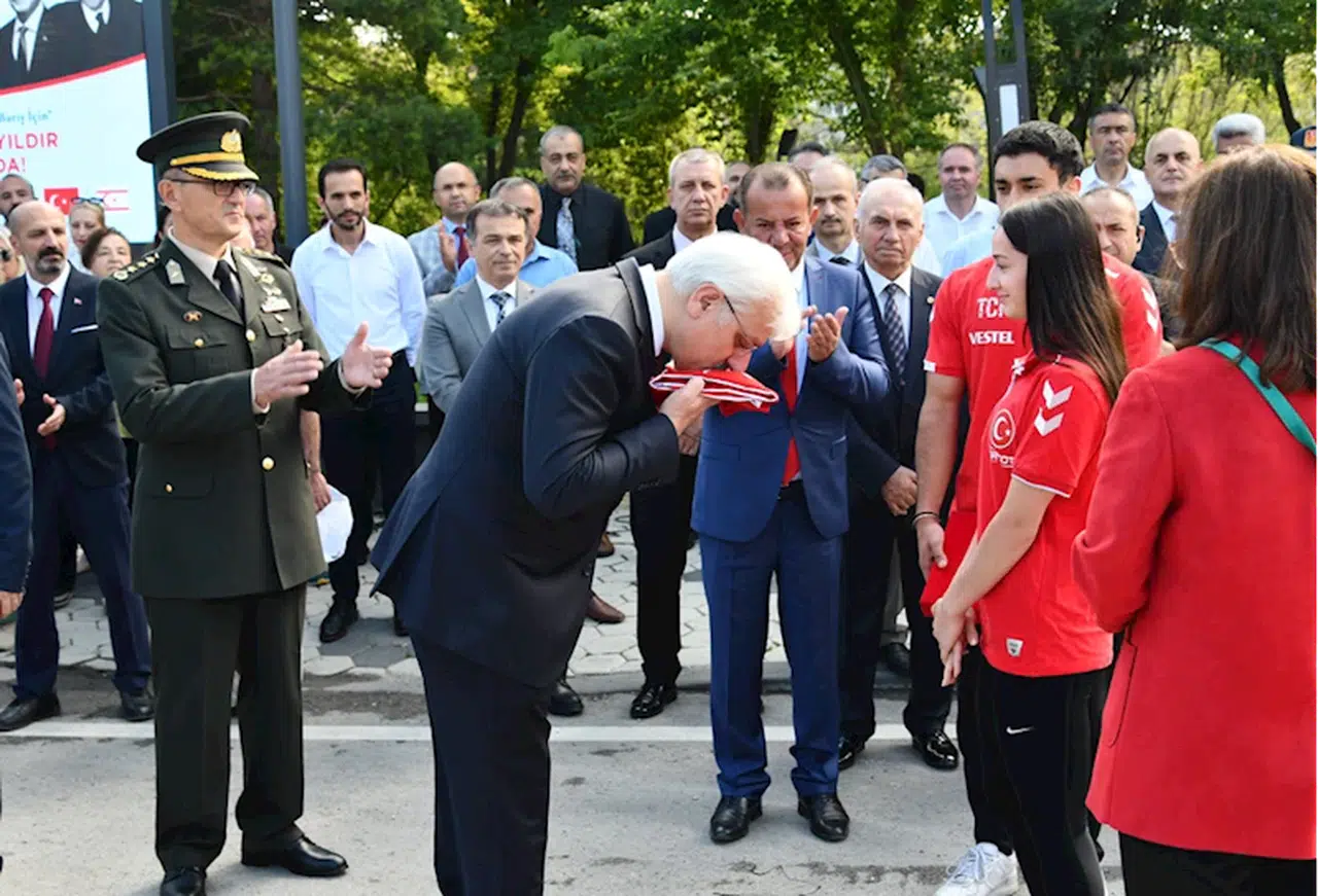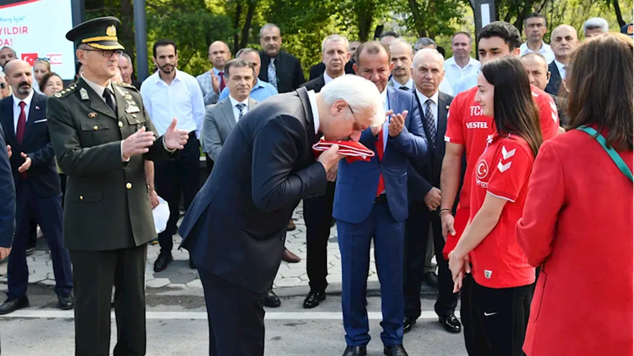 Vali Erkan Kılıç'a burada milli sporcular tarafından Türk bayrağı takdim edildi.