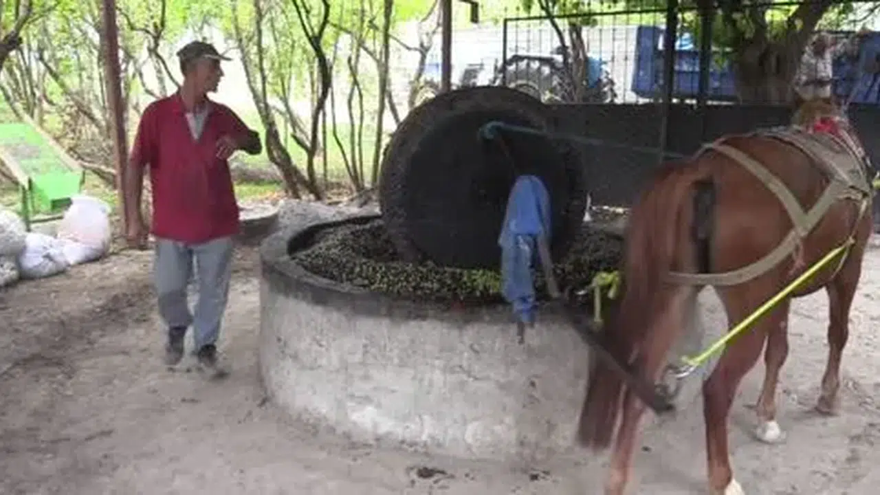 Dalından toplanan zeytinler, asırlık taş değirmenin altına yerleştiriliyor. At gücüyle çevrilen değirmende ezilen zeytinler, bir süre fıçılarda bekletiliyor. Sonrasında ılık suda yıkanan tanelerin yüzeye çıkan yağı süzülüp şişeleniyor.