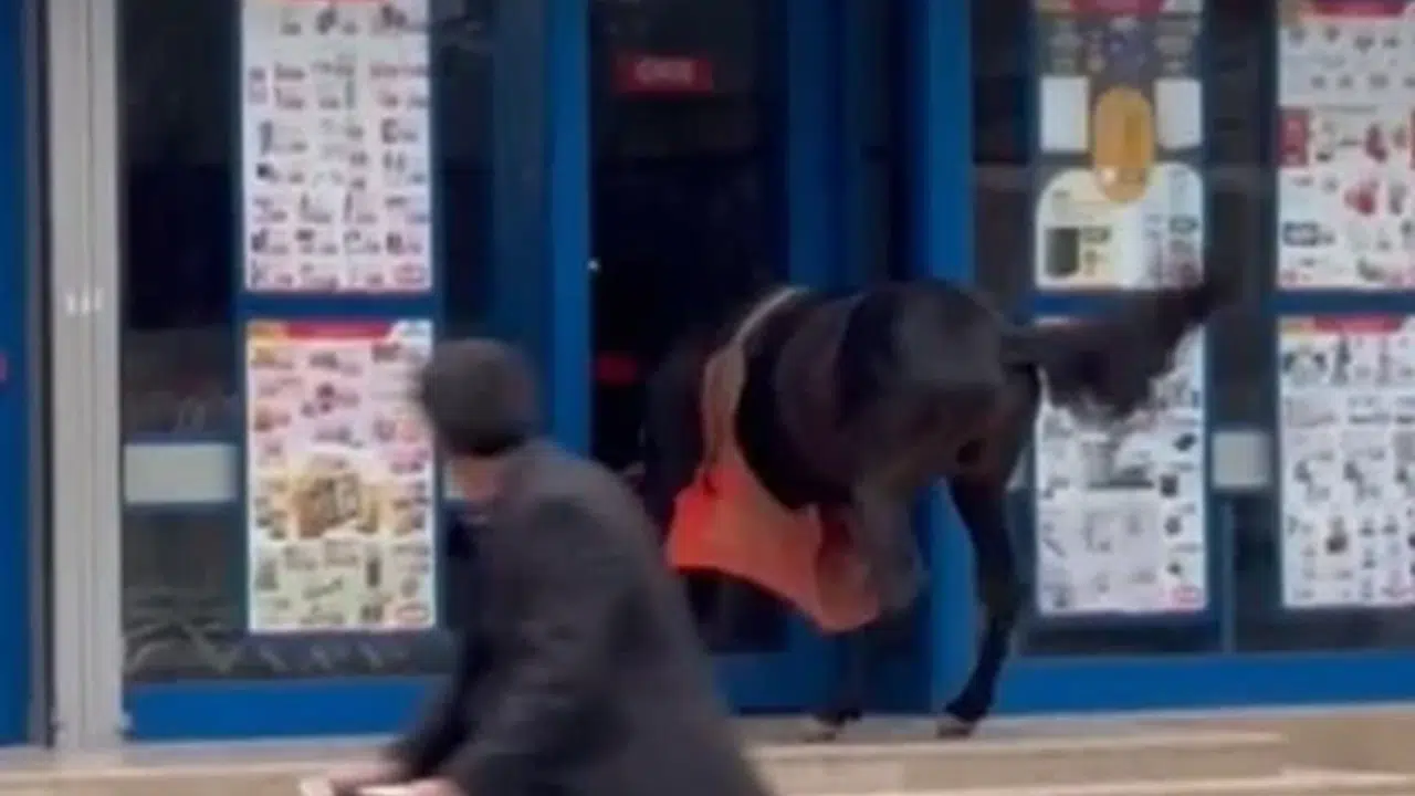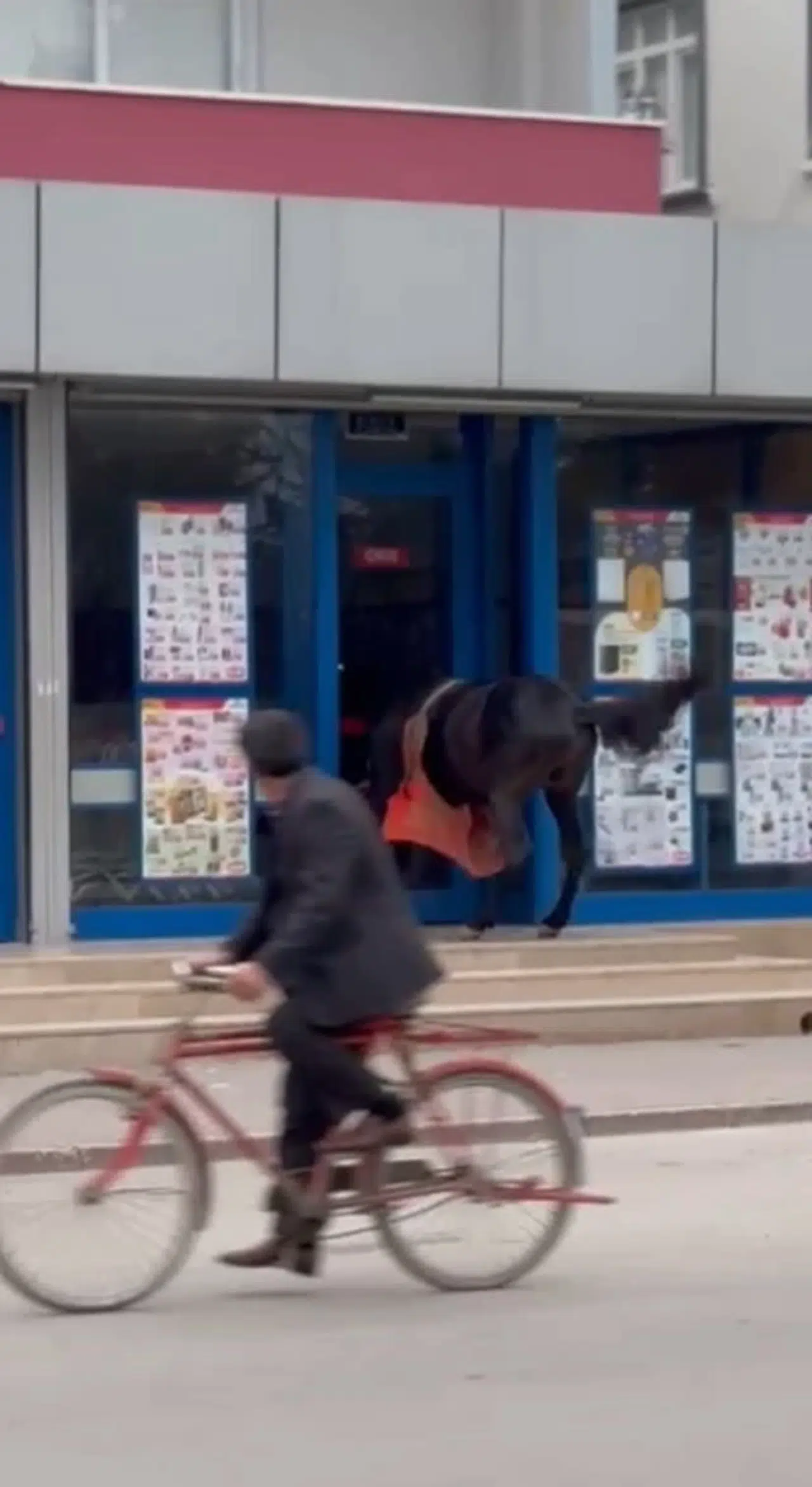 ADANA, (DHA)- ADANA’da kimliği belirsiz kişi, marketin kapısına atını bağladı. O anlar cep telefonuyla görüntülenirken, bir süre sonra sahibi atı gelip aldı.