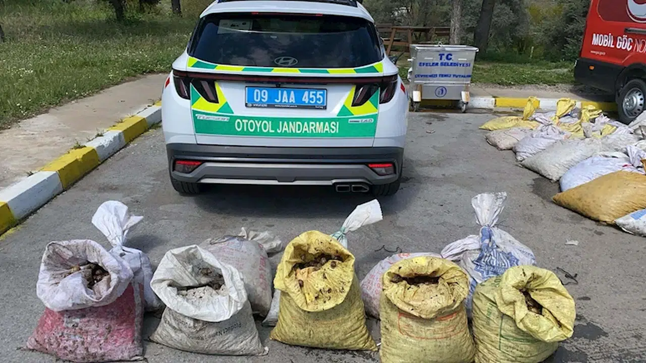 Aydın İl Jandarma Komutanlığı'na bağlı Hıdırbeyli Jandarma Otoyol Karakol Komutanlığı ekipleri, Aydın-İzmir Otoyolu Germencik gişelerinde oluşturulan kontrol noktasında bir minibüsü durdurdu. Araçta yapılan aramada, 78 çuval içerisinde 1 ton 800 kilogram doğu salyangozu ele geçirildi. Minibüs sürücüsü V.Y.'nin (60), su ürünleri ruhsat tezkeresi ile nakil ve menşe belgesinin bulunmadığı belirlendi. Salyangozlar doğaya salınmak üzere Aydın İl Tarım ve Orman Müdürlüğü ekiplerine teslim edildi.