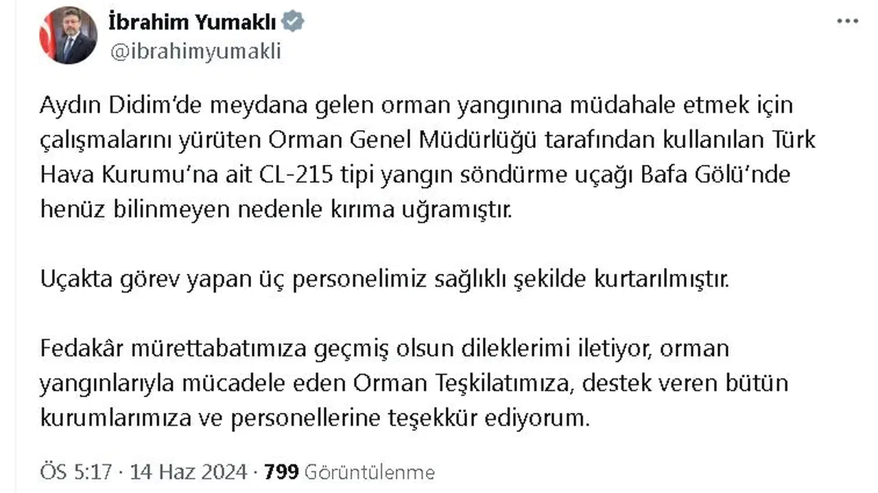 Tarım ve Orman Bakanı İbrahim Yumaklı, Aydın Didim'de meydana gelen orman yangınına müdahale etmek için çalışmalarını yürüten Orman Genel Müdürlüğü tarafından kullanılan Türk Hava Kurumu'na ait CL-215 tipi yangın söndürme uçağının Bafa Gölü'nde henüz bilinmeyen nedenle kırıma uğradığını belirterek, "Uçakta görev yapan 3 personelimiz sağlıklı şekilde kurtarılmıştır. Fedakar mürettabatımıza geçmiş olsun dileklerimi iletiyor, orman yangınlarıyla mücadele eden Orman Teşkilatımıza, destek veren bütün kurumlarımıza ve personellerine teşekkür ediyorum" dedi. (DHA)