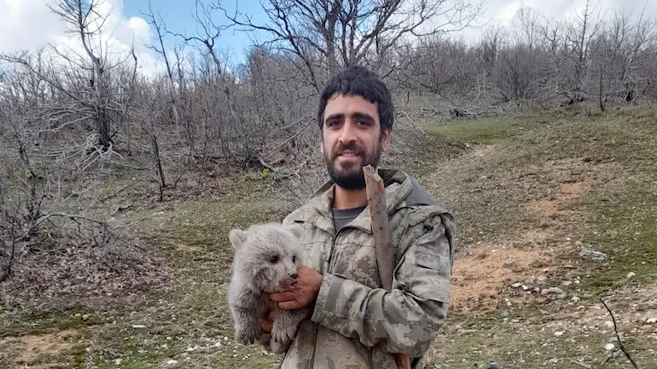 Genç ilçesi Karcı köyü kırsalında çobanlık yapan Alişan ve Hüsnü Sinen kardeşler, köpeklerin ayı yavrusuna saldırdığını gördü. Köpekleri uzaklaştıran kardeşler, yara almadan kurtardıkları yavru ayıyı doğal yaşam ortamına bıraktı. (DHA)