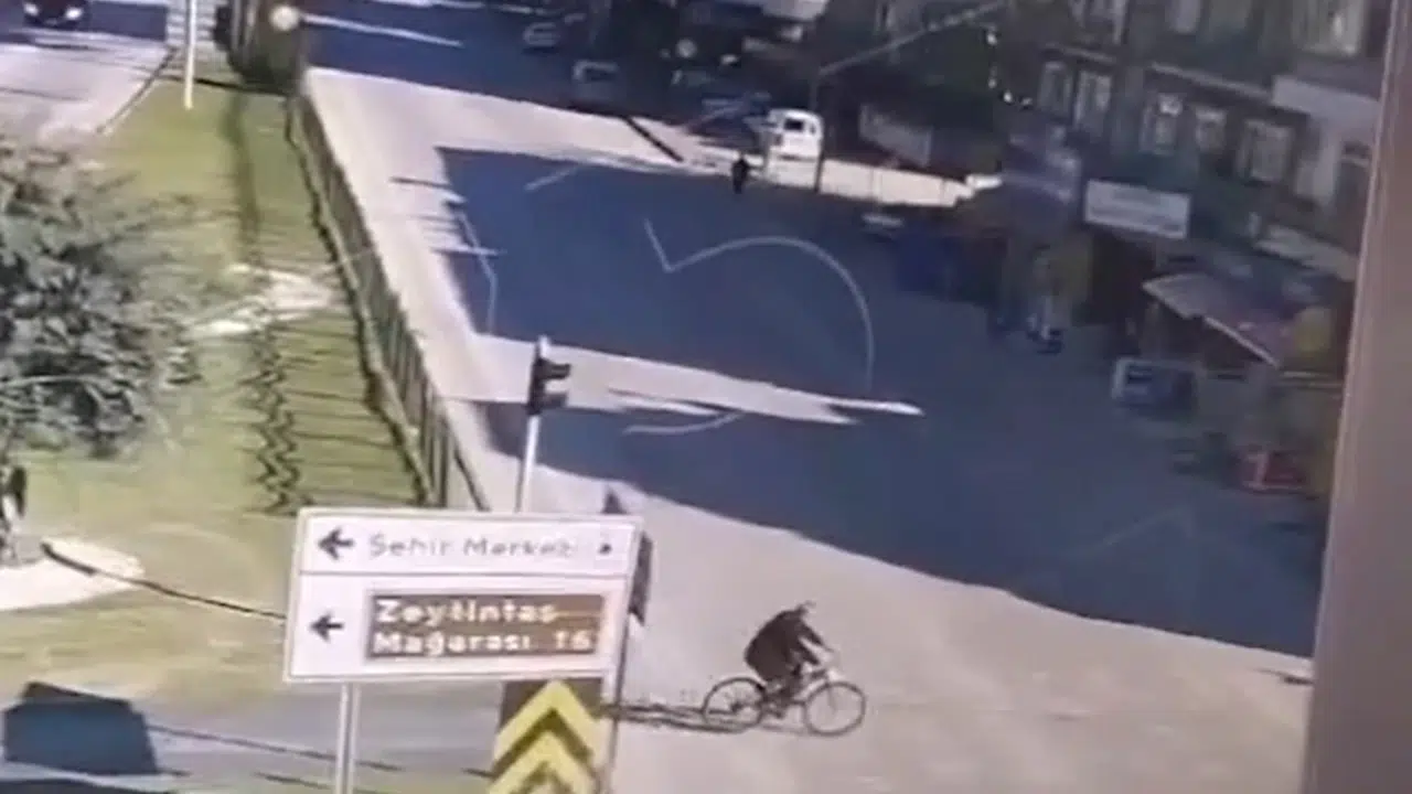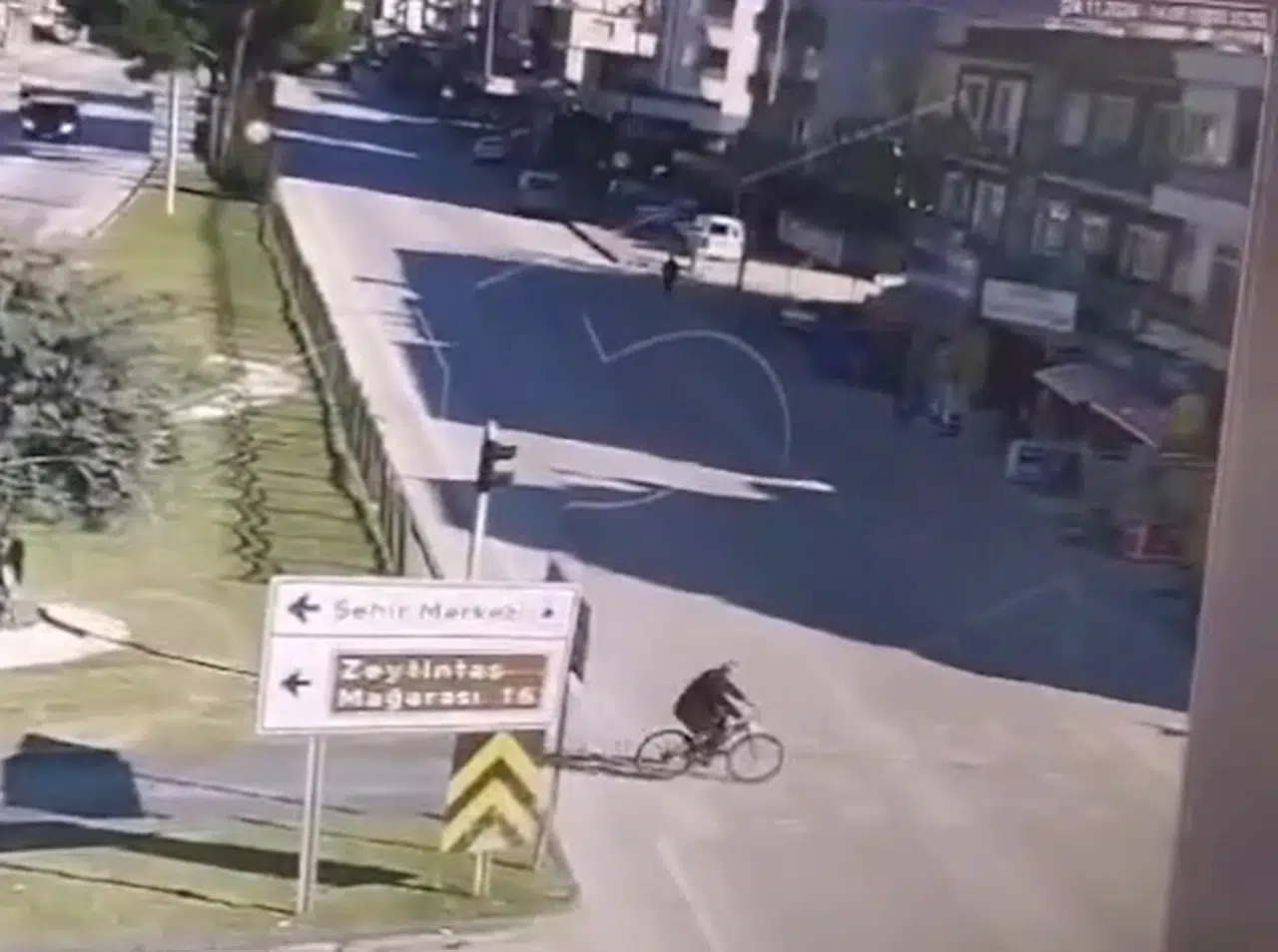 Antalya'nın Serik ilçesinden 31 Mart seçimlerinde bağımsız belediye başkan adayı olan Osman Bülüç’ün bisikletiyle yolun karşısına geçmek isterken otomobilin çarpması sonucu ağır yaralandığı kazanın güvenlik kamerası görüntüleri ortaya çıktı. Görüntüde; kavşaktaki yaya geçidi noktasından yolun karşısına geçmeye çalışan Osman Bülüç'e otomobilin çarpması, bisikletten savrulan Bülüç’ün yola düştüğü anlar yer aldı. Diğer yandan Osman Bülüç'ün çarşıdan aldığı yemeği evine götürürken kazanın meydana geldiği öğrenildi. Antalya Şehir Hastanesi'nde ameliyata alınan Osman Bülüç'ün hayati tehlikesinin devam ettiği öğrenildi. (DHA)