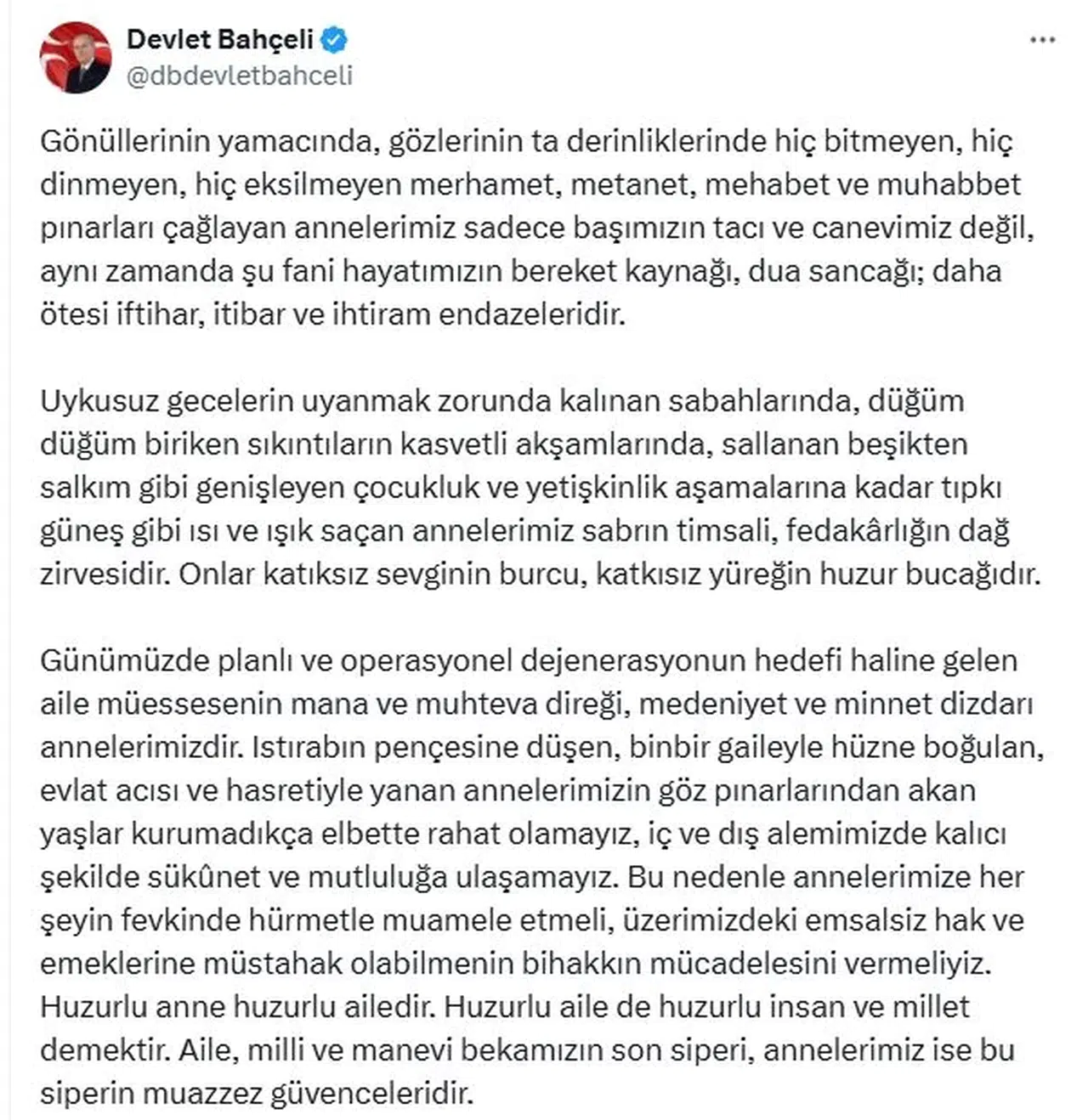 ANKARA, (DHA)- MHP Genel Başkanı Devlet Bahçeli, "Istırabın pençesine düşen, bin bir gaileyle hüzne boğulan, evlat acısı ve hasretiyle yanan annelerimizin göz pınarlarından akan yaşlar kurumadıkça elbette rahat olamayız, iç ve dış alemimizde kalıcı şekilde sükunet ve mutluluğa ulaşamayız" dedi.