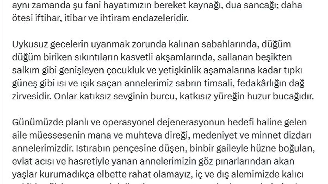 MHP Genel Başkanı Devlet Bahçeli, Anneler Günü nedeniyle sosyal medya hesabından mesaj paylaştı. Bahçeli, "Gönüllerinin yamacında, gözlerinin ta derinliklerinde hiç bitmeyen, hiç dinmeyen, hiç eksilmeyen merhamet, metanet, mehabet ve muhabbet pınarları çağlayan annelerimiz sadece başımızın tacı ve can evimiz değil, aynı zamanda şu fani hayatımızın bereket kaynağı, dua sancağı; daha ötesi iftihar, itibar ve ihtiram endazeleridir. Uykusuz gecelerin uyanmak zorunda kalınan sabahlarında, düğüm düğüm biriken sıkıntıların kasvetli akşamlarında, sallanan beşikten salkım gibi genişleyen çocukluk ve yetişkinlik aşamalarına kadar tıpkı güneş gibi ısı ve ışık saçan annelerimiz sabrın timsali, fedakarlığın dağ zirvesidir. Onlar katıksız sevginin burcu, katkısız yüreğin huzur bucağıdır" dedi.