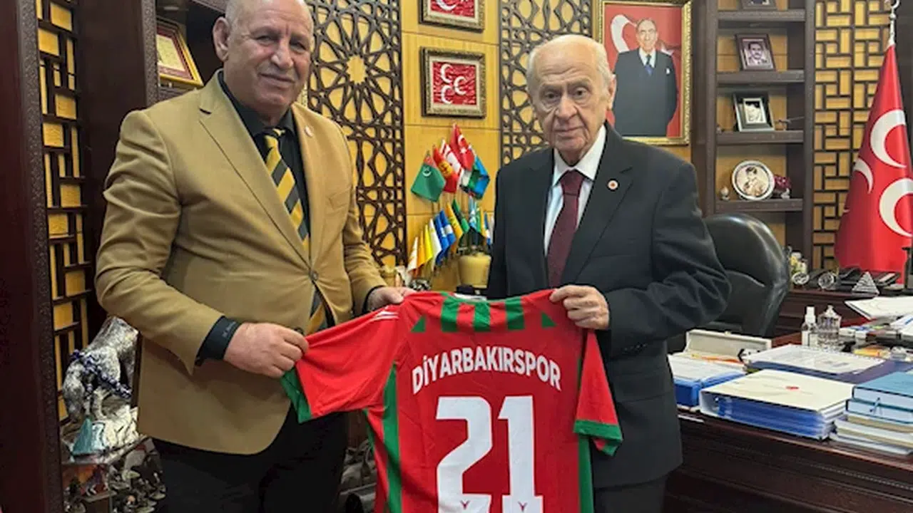 MHP Diyarbakır İl Başkanı Miktat Arslan ve Diyarbakırspor Başkanı Bedirhan Akyol, MHP Genel Başkanı Bahçeli'yi parti genel merkezindeki makamında ziyaret etti. Bedirhan Akyol, sırtında 'Devlet Bahçeli' yazan 21 numaralı Diyarbakırspor formasını Bahçeli'ye hediye etti. Bahçeli, ziyaretçileri ile hatıra fotoğrafı çektirdi. (DHA)
