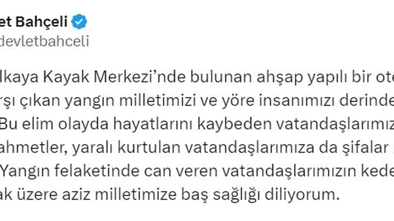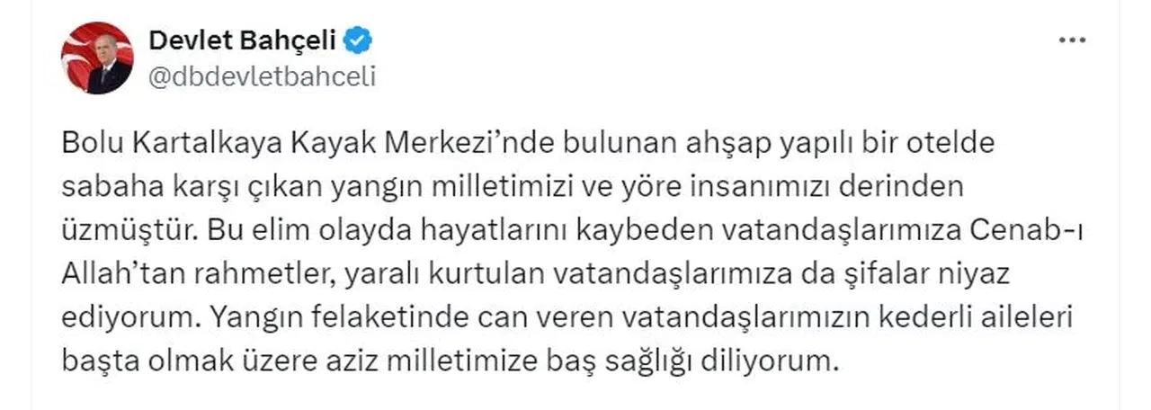 ANKARA, (DHA)- MHP Genel Başkanı Devlet Bahçeli, Bolu Kartalkaya'daki otelde çıkan yangında hayatını kaybedenler için taziye mesajı yayımladı.