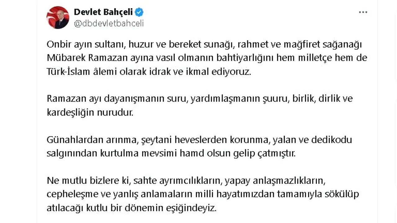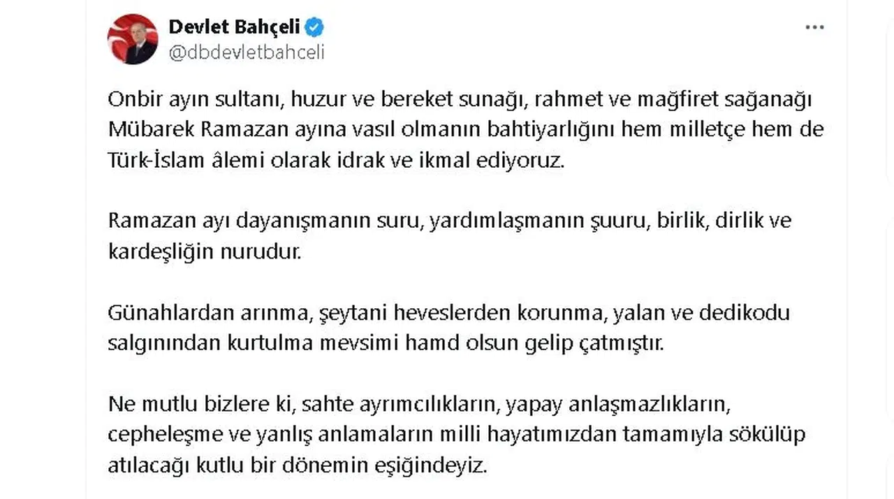 MHP Genel Başkanı Devlet Bahçeli, ramazan ayının başlangıcı nedeniyle sosyal medya hesabından paylaştığı mesajda, "11 ayın sultanı, huzur ve bereket sunağı, rahmet ve mağfiret sağanağı mübarek ramazan ayına vasıl olmanın bahtiyarlığını hem milletçe hem de Türk-İslam alemi olarak idrak ve ikmal ediyoruz. Ramazan ayı dayanışmanın suru, yardımlaşmanın şuuru, birlik, dirlik ve kardeşliğin nurudur. Günahlardan arınma, şeytani heveslerden korunma, yalan ve dedikodu salgınından kurtulma mevsimi hamdolsun gelip çatmıştır. Ne mutlu bizlere ki sahte ayrımcılıkların, yapay anlaşmazlıkların, cepheleşme ve yanlış anlamaların milli hayatımızdan tamamıyla sökülüp atılacağı kutlu bir dönemin eşiğindeyiz. Sahurdan iftara kadar hep birlikte ifa ve icra edeceğimiz dua ve ibadetlerimizle oruçlarımızın hakkını vereceğimize yürekten inanıyorum" dedi.