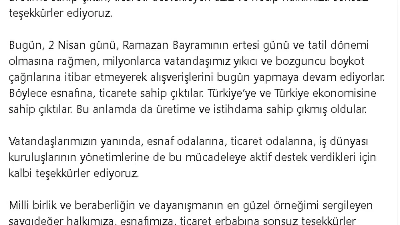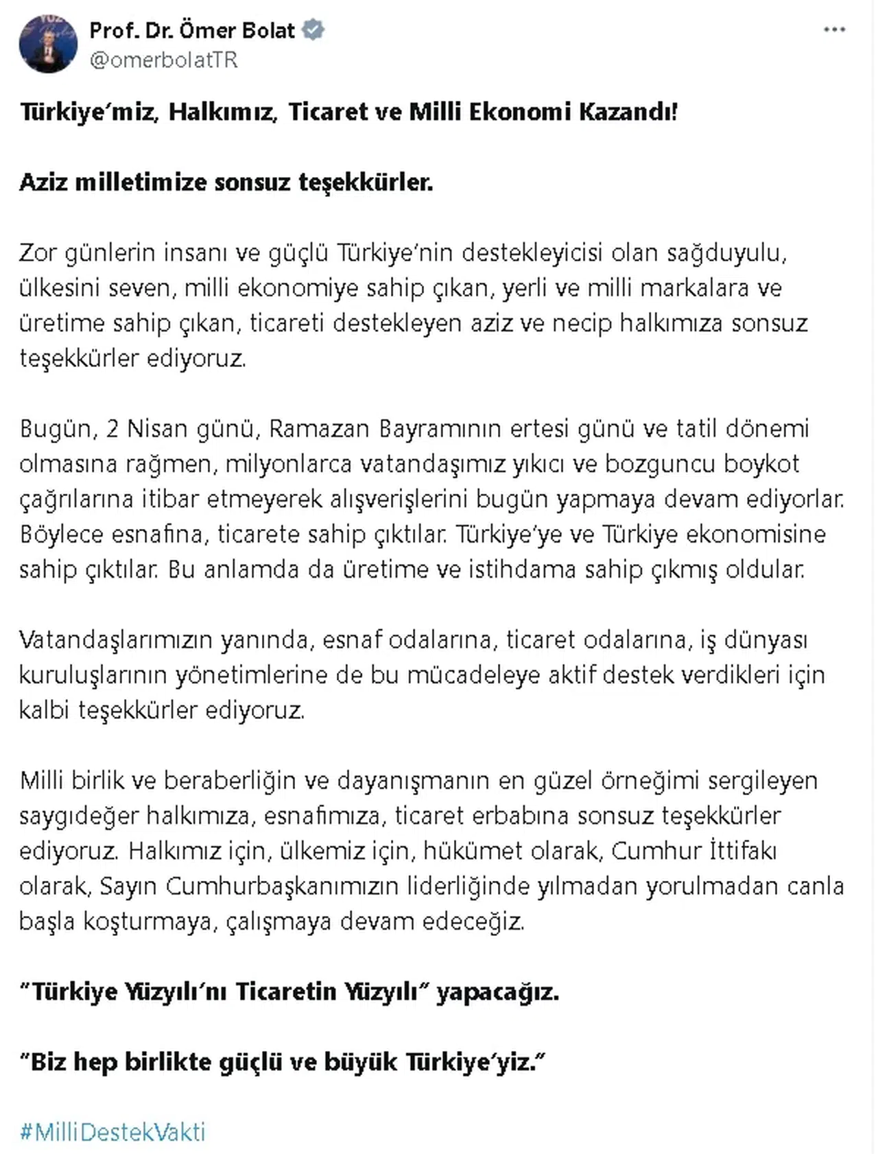 Ticaret Bakanı Ömer Bolat, boykot çağrılarına ilişkin sosyal medya hesabından açıklama yaptı. Bolat, "Türkiye'miz, halkımız, ticaret ve milli ekonomi kazandı. Aziz milletimize sonsuz teşekkürler. Zor günlerin insanı ve güçlü Türkiye’nin destekleyicisi olan sağduyulu, ülkesini seven, milli ekonomiye sahip çıkan, yerli ve milli markalara ve üretime sahip çıkan, ticareti destekleyen aziz ve necip halkımıza sonsuz teşekkürler ediyoruz. Bugün, 2 Nisan günü, Ramazan Bayramı'nın ertesi günü ve tatil dönemi olmasına rağmen, milyonlarca vatandaşımız yıkıcı ve bozguncu boykot çağrılarına itibar etmeyerek alışverişlerini bugün yapmaya devam ediyorlar. Böylece esnafına, ticarete sahip çıktılar. Türkiye'ye ve Türkiye ekonomisine sahip çıktılar. Bu anlamda da üretime ve istihdama sahip çıkmış oldular" dedi.