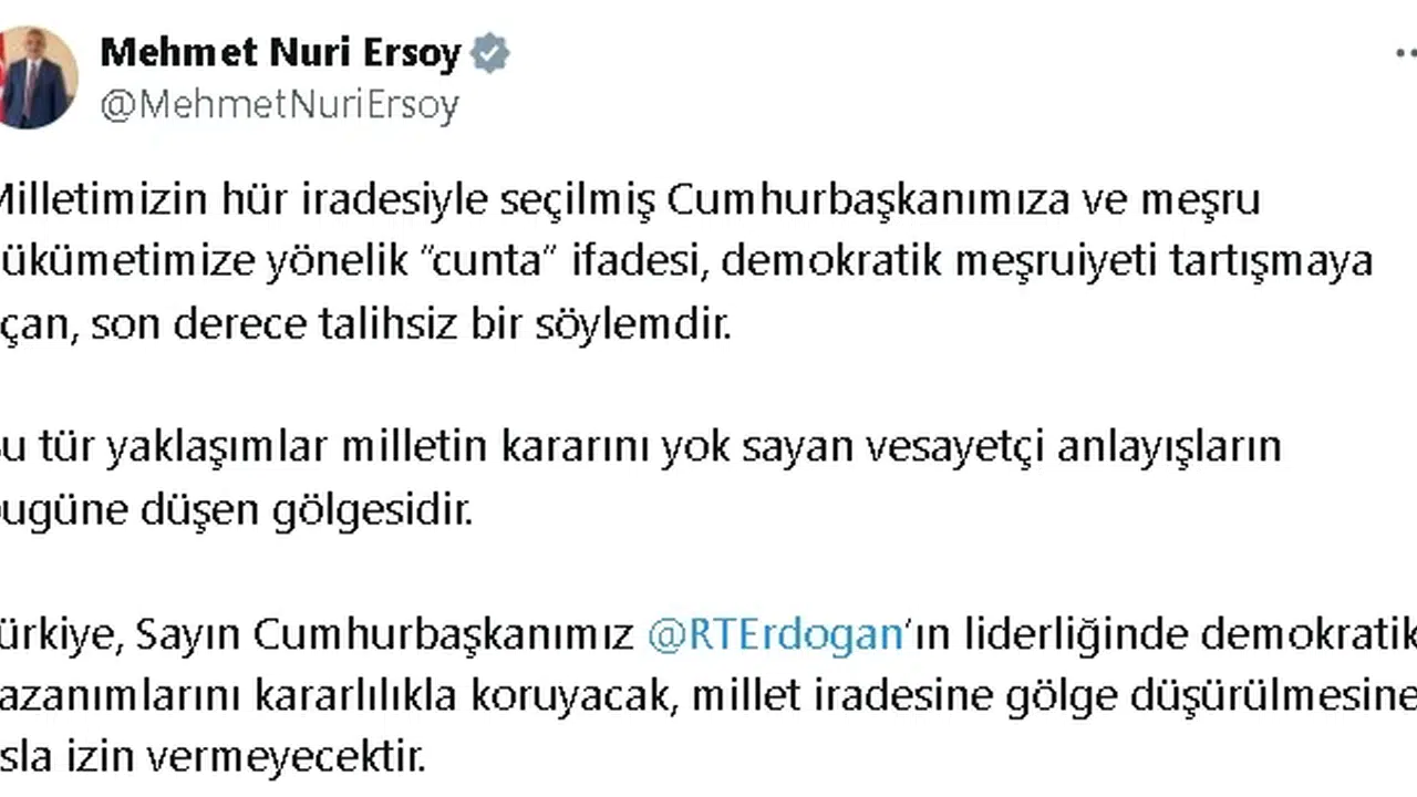 Bakan Ersoy, sosyal medya hesabı üzerinden yaptığı paylaşımda, "Milletimizin hür iradesiyle seçilmiş Cumhurbaşkanımıza ve meşru hükümetimize yönelik 'cunta' ifadesi, demokratik meşruiyeti tartışmaya açan, son derece talihsiz bir söylemdir. Bu tür yaklaşımlar milletin kararını yok sayan vesayetçi anlayışların bugüne düşen gölgesidir. Türkiye, Sayın Cumhurbaşkanımız Recep Tayyip Erdoğan’ın liderliğinde demokratik kazanımlarını kararlılıkla koruyacak, millet iradesine gölge düşürülmesine asla izin vermeyecektir" ifadelerini kullandı. (DHA)
