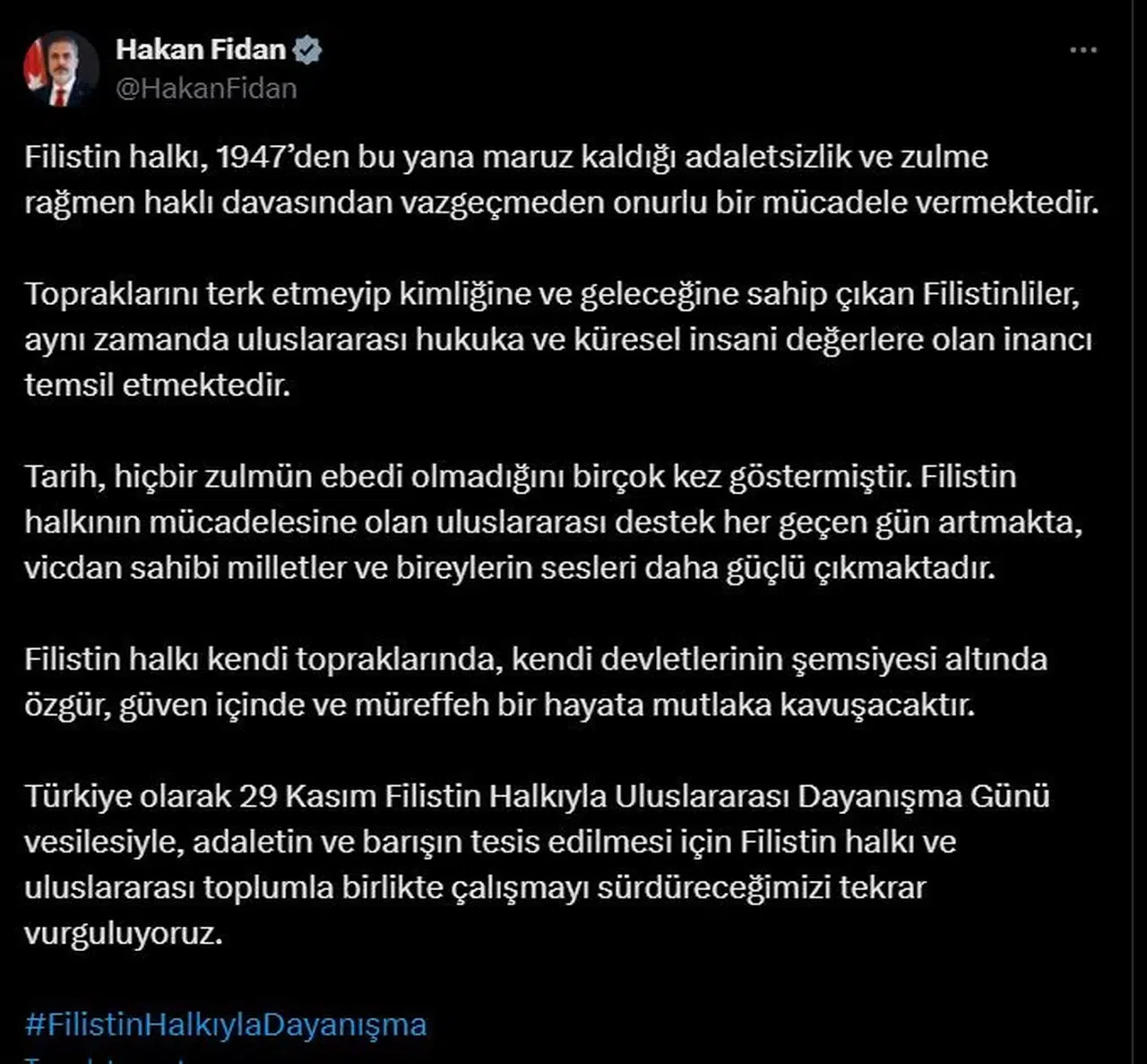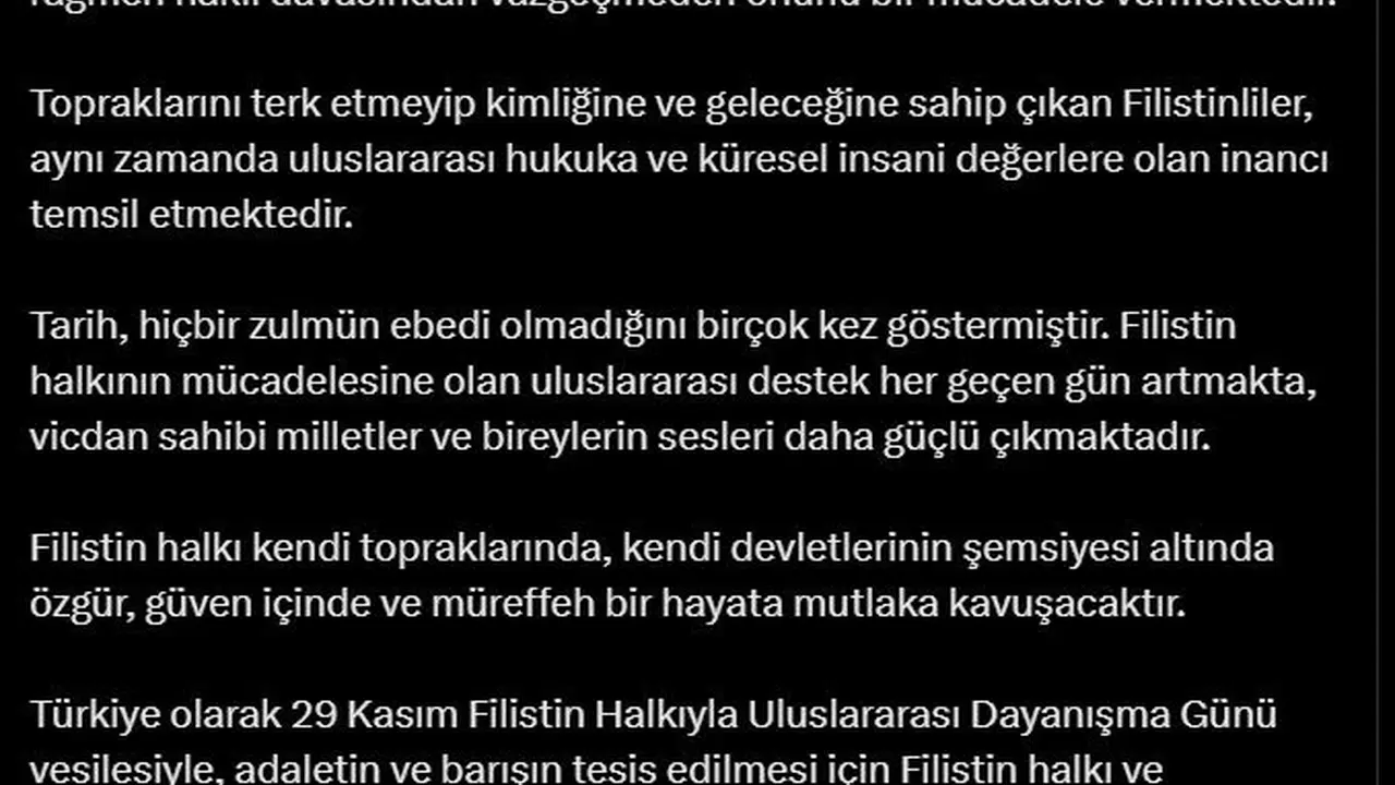 Gizem ÇORLU/ANKARA, (DHA)- DIŞİŞLERİ Bakanı Hakan Fidan, '29 Kasım Filistin Halkıyla Uluslararası Dayanışma Günü' nedeniyle mesaj yayımladı.