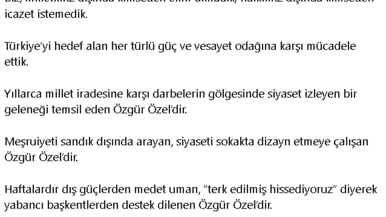 Bakan Fidan, sosyal medya hesabı üzerinden yaptığı paylaşımda, "Artık haddini bil! Cumhurbaşkanımız Sayın Recep Tayyip Erdoğan, milletimizden aldığı destekle senelerdir Türkiye’ye hizmet etmiş, her türlü vesayete karşı savaşmıştır. Biz, milletimiz dışında kimseden emir almadık; halkımız dışında kimseden icazet istemedik. Türkiye’yi hedef alan her türlü güç ve vesayet odağına karşı mücadele ettik. Yıllarca millet iradesine karşı darbelerin gölgesinde siyaset izleyen bir geleneği temsil eden Özgür Özel’dir. Meşruiyeti sandık dışında arayan, siyaseti sokakta dizayn etmeye çalışan Özgür Özel’dir. Haftalardır dış güçlerden medet uman, ‘terk edilmiş hissediyoruz’ diyerek yabancı başkentlerden destek dilenen Özgür Özel’dir. Yolsuzlukla ilgili bir davadan kahramanlık hikayesi çıkarmaya çalışan Özgür Özel’dir. Kendi kişisel hırslarını, komplo teorileriyle harmanlayıp siyaset kisvesi altında sunan bu zihniyeti reddediyoruz! Biz, milletimize hizmet yolunda kararlılıkla çalışmaya devam edeceğiz" ifadelerine yer verdi. (DHA)