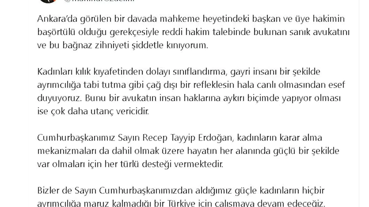 ANKARA, (DHA)- AİLE ve Sosyal Hizmetler Bakanı Mahinur Özdemir Göktaş, "Ankara'da görülen bir davada mahkeme heyetindeki başkan ve üye hakimin başörtülü olduğu gerekçesiyle reddi hakim talebinde bulunan sanık avukatını ve bu bağnaz zihniyeti şiddetle kınıyorum" dedi.