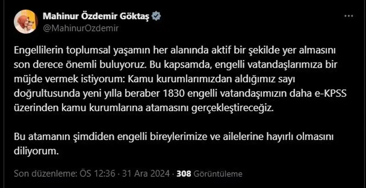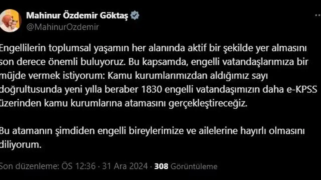 Bakan Göktaş, sosyal medya hesabından yaptığı açıklamada, "Engellilerin toplumsal yaşamın her alanında aktif bir şekilde yer almasını son derece önemli buluyoruz. Bu kapsamda, engelli vatandaşlarımıza bir müjde vermek istiyorum. Kamu kurumlarımızdan aldığımız sayı doğrultusunda yeni yılla beraber 1830 engelli vatandaşımızın daha EKPSS üzerinden kamu kurumlarına atamasını gerçekleştireceğiz. Bu atamanın şimdiden engelli bireylerimize ve ailelerine hayırlı olmasını diliyorum" dedi. (DHA)