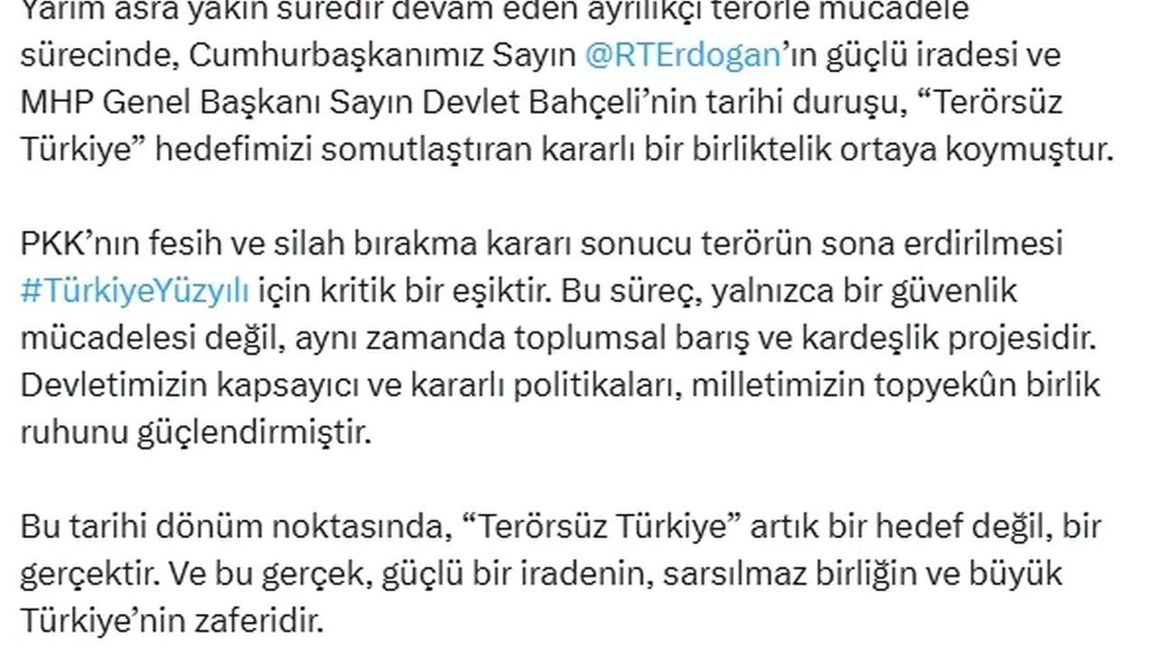 Bakan Göktaş, sosyal medya hesabı üzerinden yaptığı açıklamada, "Yarım asra yakın süredir devam eden ayrılıkçı terörle mücadele sürecinde, Cumhurbaşkanımız Sayın Recep Tayyip Erdoğan’ın güçlü iradesi ve MHP Genel Başkanı Sayın Devlet Bahçeli’nin tarihi duruşu, 'Terörsüz Türkiye' hedefimizi somutlaştıran kararlı bir birliktelik ortaya koymuştur. PKK'nın fesih ve silah bırakma kararı sonucu terörün sona erdirilmesi Türkiye Yüzyılı için kritik bir eşiktir. Bu süreç, yalnızca bir güvenlik mücadelesi değil, aynı zamanda toplumsal barış ve kardeşlik projesidir. Devletimizin kapsayıcı ve kararlı politikaları, milletimizin topyekûn birlik ruhunu güçlendirmiştir. Bu tarihi dönüm noktasında, 'Terörsüz Türkiye' artık bir hedef değil, bir gerçektir. Ve bu gerçek, güçlü bir iradenin, sarsılmaz birliğin ve büyük Türkiye’nin zaferidir. Terörle mücadele sürecinde canlarını feda eden aziz şehitlerimizi rahmet ve minnetle anıyor, gazilerimize saygı ve şükranlarımı iletiyorum" ifadelerini kullandı. (DHA)