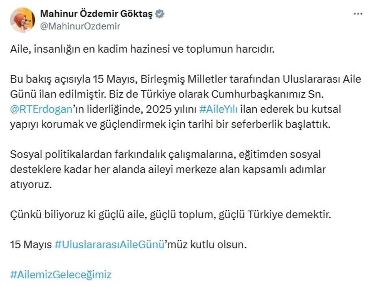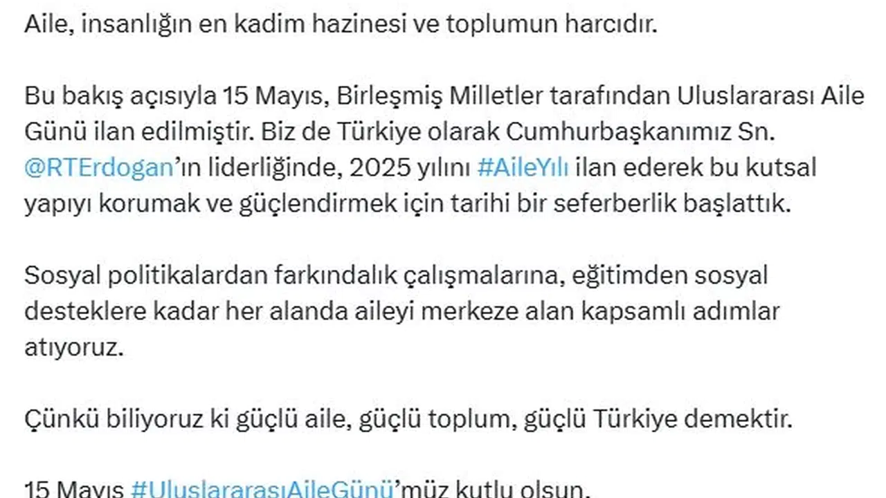 Aile ve Sosyal Hizmetler Bakanı Mahinur Özdemir Göktaş, sosyal medya hesabından paylaştığı mesajında, "Aile, insanlığın en kadim hazinesi ve toplumun harcıdır. Bu bakış açısıyla 15 Mayıs, Birleşmiş Milletler tarafından Uluslararası Aile Günü ilan edilmiştir. Biz de Türkiye olarak Cumhurbaşkanımız Sayın Recep Tayyip Erdoğan'ın liderliğinde, 2025 yılını Aile Yılı ilan ederek bu kutsal yapıyı korumak ve güçlendirmek için tarihi bir seferberlik başlattık. Sosyal politikalardan farkındalık çalışmalarına, eğitimden sosyal desteklere kadar her alanda aileyi merkeze alan kapsamlı adımlar atıyoruz. Çünkü biliyoruz ki güçlü aile, güçlü toplum, güçlü Türkiye demektir. 15 Mayıs Uluslararası Aile Günümüz kutlu olsun" ifadelerini kullandı. (DHA)