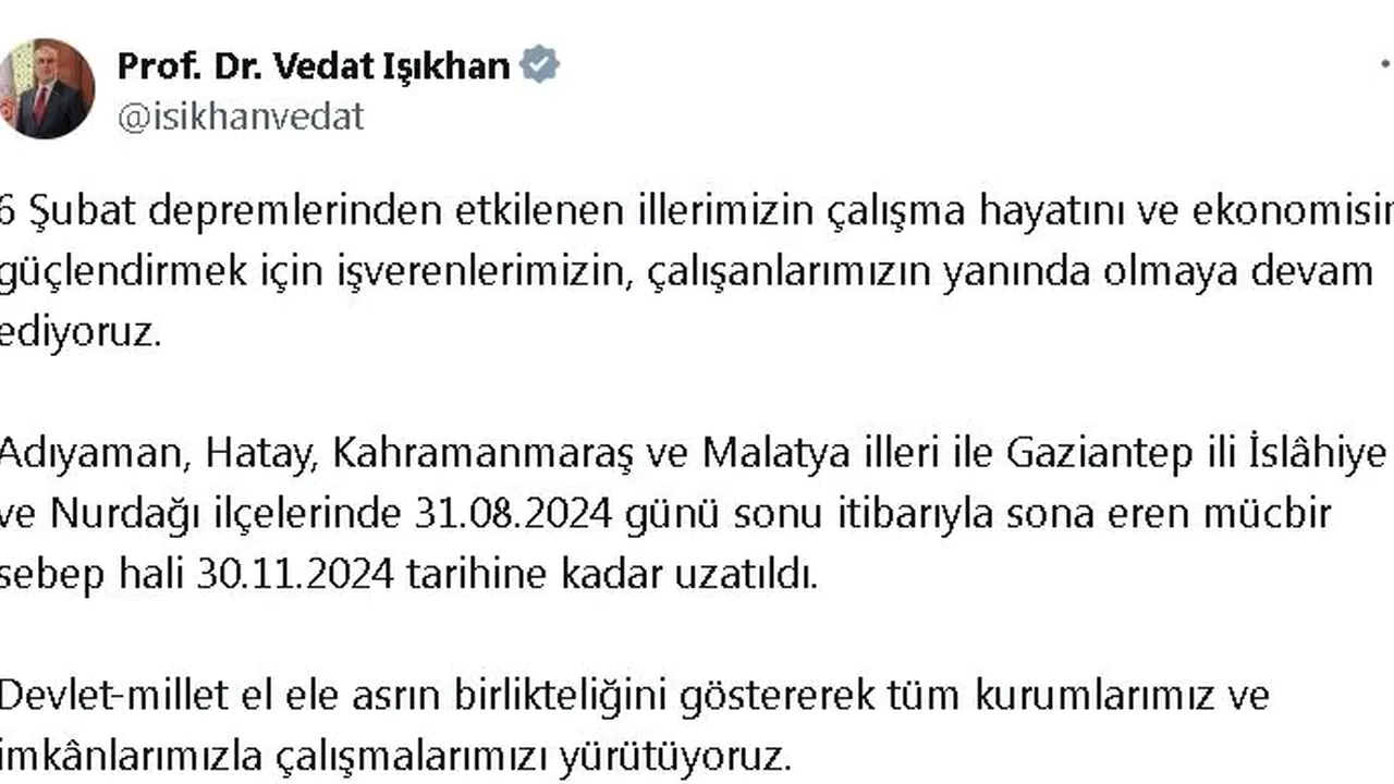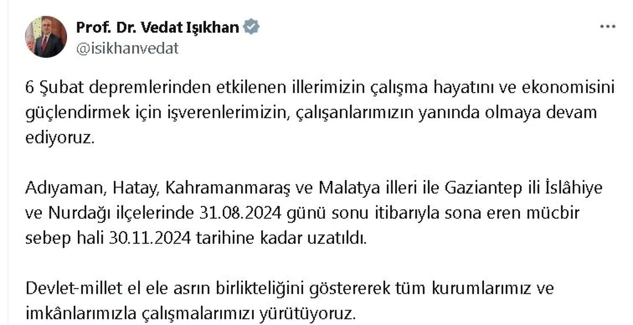ANKARA, (DHA)- ÇALIŞMA ve Sosyal Güvenlik Bakanı Vedat Işıkhan, Adıyaman, Hatay, Kahramanmaraş ve Malatya ile Gaziantep'in İslahiye ve Nurdağı ilçelerinde 31 Ağustos 2024 tarihi itibarıyla sona eren mücbir sebep halinin 30 Kasım 2024 tarihine kadar uzatıldığını açıkladı.