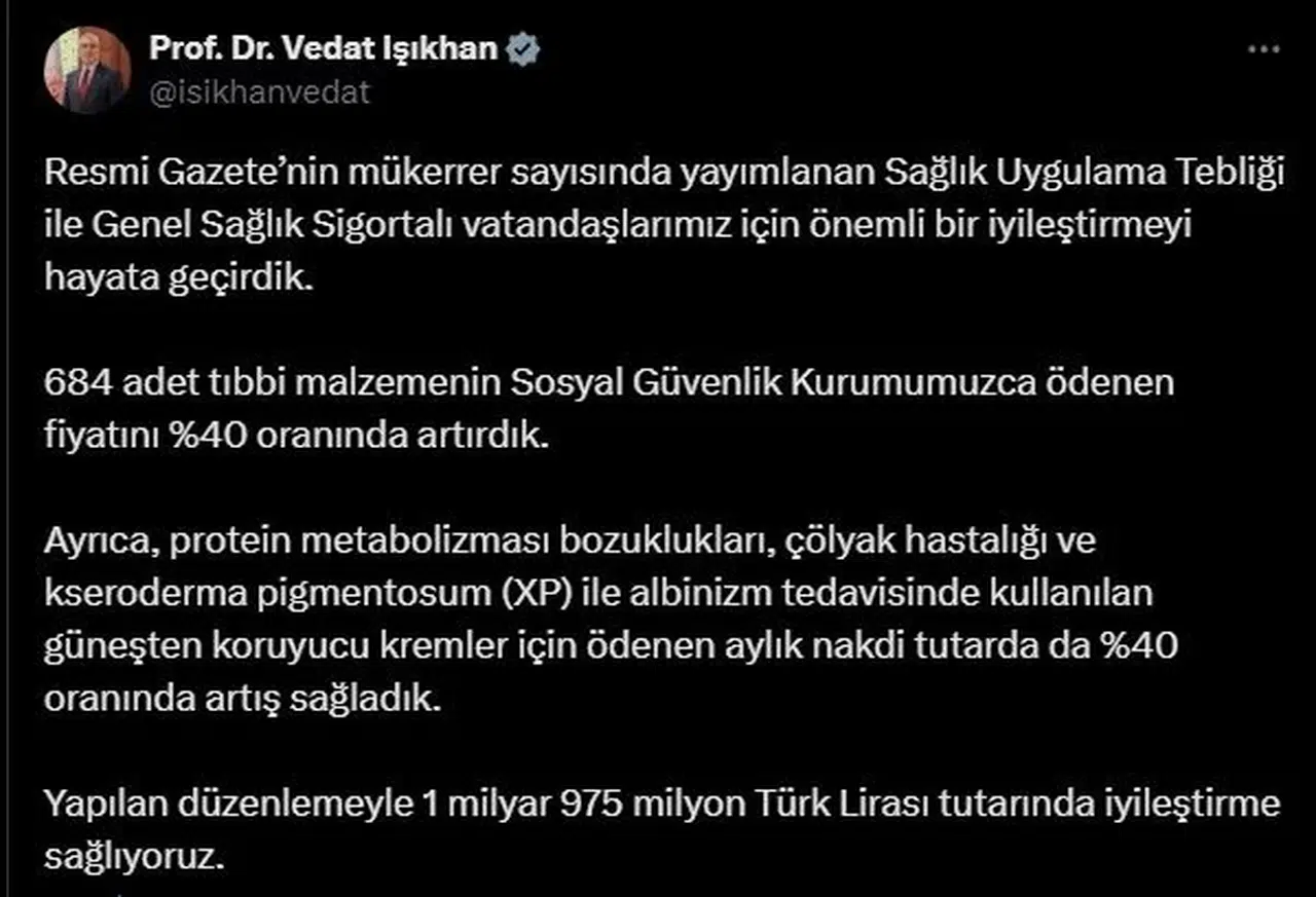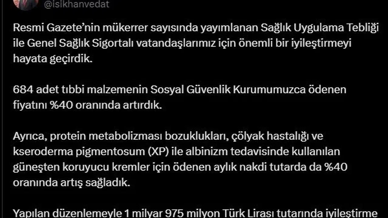 Bakan Işıkhan, sosyal medya hesabından yaptığı açıklamada, "Resmi Gazete’nin mükerrer sayısında yayımlanan Sağlık Uygulama Tebliği ile Genel Sağlık Sigortalı vatandaşlarımız için önemli bir iyileştirmeyi hayata geçirdik. 684 adet tıbbi malzemenin Sosyal Güvenlik Kurumu'muzca ödenen fiyatını yüzde 40 oranında artırdık. Ayrıca, protein metabolizması bozuklukları, çölyak hastalığı ve kseroderma pigmentosum (XP) ile albinizm tedavisinde kullanılan güneşten koruyucu kremler için ödenen aylık nakdi tutarda da yüzde 40 oranında artış sağladık. Yapılan düzenlemeyle 1 milyar 975 milyon TL tutarında iyileştirme sağlıyoruz" ifadelerini kullandı. (DHA)