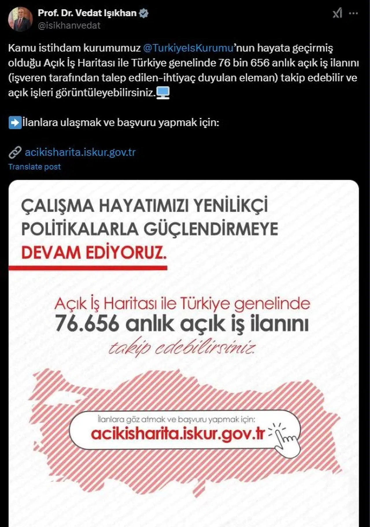 Gizem ÇORLU/ANKARA, (DHA)- ÇALIŞMA ve Sosyal Güvenlik Bakanı Vedat Işıkhan, Türkiye İş Kurumu'nun (İŞ-KUR) hayata geçirdiği Açık İş Haritası ile Türkiye genelinde 76 bin 656 anlık açık iş ilanının görüntülenebildiğini açıkladı.