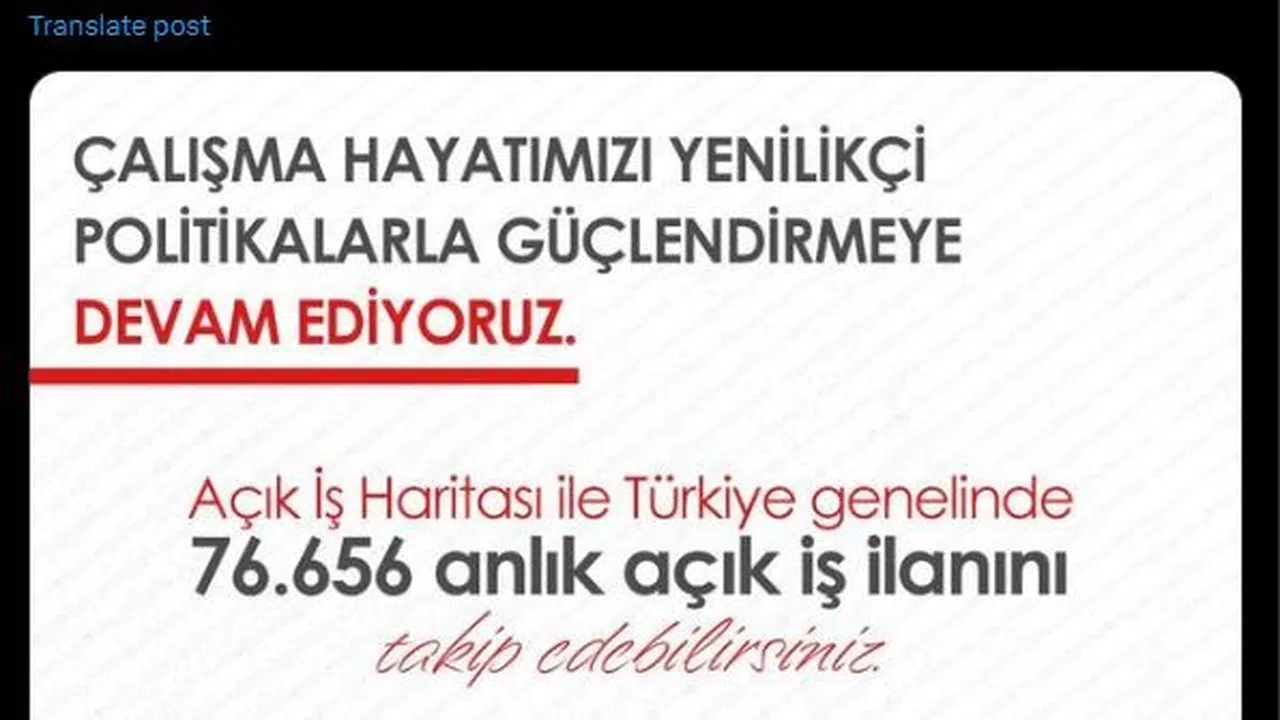 Bakan Işıkhan, sosyal medya hesabından yaptığı açıklamada, “Kamu istihdam kurumuz Türkiye İş Kurumu'nun hayata geçirmiş olduğu Açık İş Haritası ile Türkiye genelinde 76 bin 656 anlık açık iş ilanını (işveren tarafından talep edilen-ihtiyaç duyulan eleman), takip edebilir ve açık işleri görüntüleyebilirsiniz" ifadelerini kullandı. (DHA)