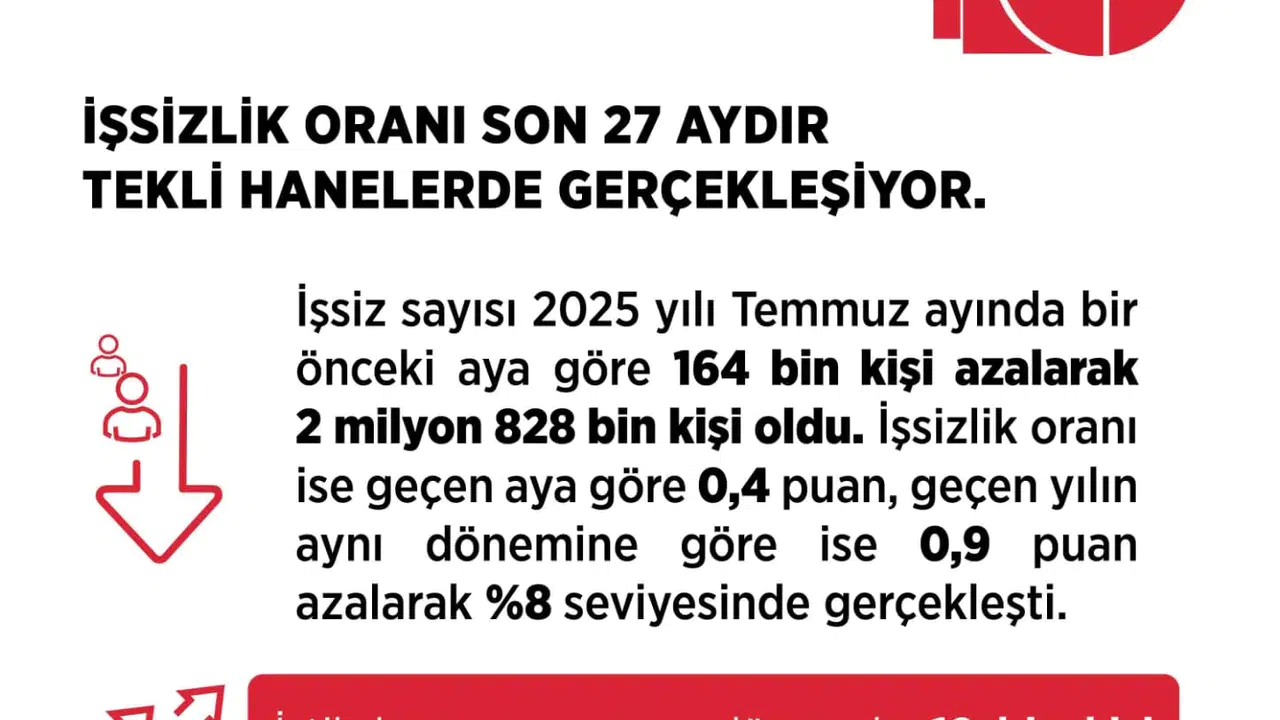 Çalışma ve Sosyal Güvenlik Bakanı Vedat Işıkhan, temmuz ayı iş gücü istatistiklerine ilişkin sosyal medya hesabından açıklama yaptı. Bakan Işıkhan, "İşsizlikle etkin mücadeleyi ve çalışma hayatını güçlendirecek tedbirleri içeren Orta Vadeli Programımız ile Ulusal İstihdam Stratejimiz (UİS) kapsamında çalışmalarımızı sürdürüyoruz. Bugün açıklanan iş gücü verilerinde; işsiz sayısı 2025 yılı Temmuz ayında bir önceki aya göre 164 bin kişi azalarak 2 milyon 828 bin kişi oldu. İşsizlik oranı ise geçen aya göre 0,4 puan, geçen yılın aynı dönemine göre ise 0,9 puan azalarak yüzde 8 seviyesinde gerçekleşti. 27 aydır tek haneli seviyelerde gerçekleşen işsizlik oranı, OVP ve diğer politikalarımız ile uyumlu seyretmektedir. İstihdam edilenlerin sayısı ise aynı dönemde 18 bin kişi artarak 32 milyon 582 bin kişiye ulaştı. İstihdam oranı yüzde 49,1 seviyesini korudu" dedi.