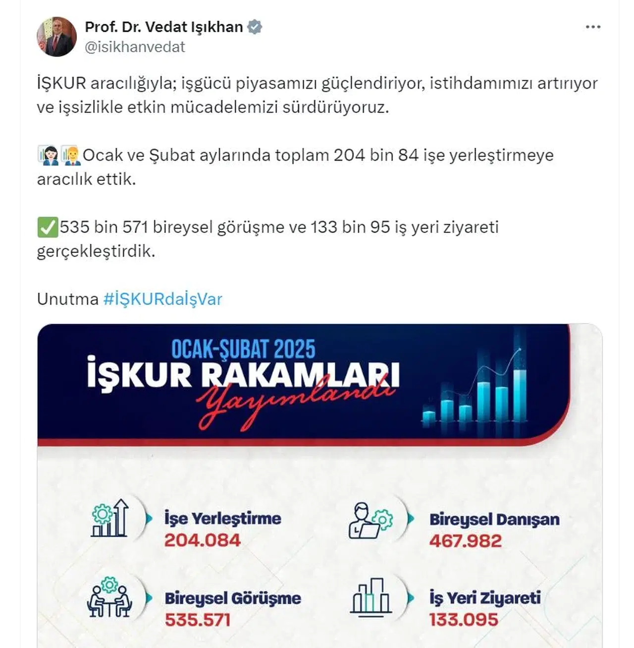 ANKARA, (DHA)- ÇALIŞMA ve Sosyal Güvenlik Bakanı Vedat Işıkhan, Türkiye İş Kurumu (İŞKUR) ile ocak ve şubat aylarında toplam 204 bin 84 işe yerleştirmeye aracılık ettiklerini duyurdu.