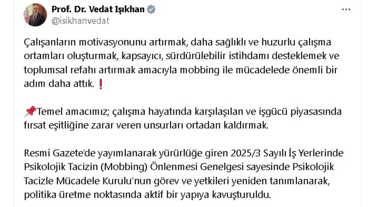 Bakan Işıkhan, sosyal medya hesabından yaptığı açıklamada, "Çalışanların motivasyonunu artırmak, daha sağlıklı ve huzurlu çalışma ortamları oluşturmak, kapsayıcı, sürdürülebilir istihdamı desteklemek ve toplumsal refahı artırmak amacıyla mobbing ile mücadelede önemli bir adım daha attık. Temel amacımız; çalışma hayatında karşılaşılan ve iş gücü piyasasında fırsat eşitliğine zarar veren unsurları ortadan kaldırmak. Resmi Gazete'de yayımlanarak yürürlüğe giren 2025/3 sayılı 'İş Yerlerinde Psikolojik Tacizin (Mobbing) Önlenmesi Genelgesi' sayesinde Psikolojik Tacizle Mücadele Kurulu'nun görev ve yetkileri yeniden tanımlanarak, politika üretme noktasında aktif bir yapıya kavuşturuldu. Kurul üyeleri revize edilerek ve Kurul'a katılım sağlayan kurum ve kuruluşların kapsamı genişletildi. Kurul'un yapısı, görev alanları ve kapsamı belirlendi. İşverenin sorumluluğunun kapsamı genişletildi. Gizlilik ilkesinin önemi vurgulandı ve gerçeğe aykırı iddiaların önlenmesi için düzenleme yapıldı. Eğitim ve bilgilendirme faaliyetlerini yürütecek kurum ve kuruluşların kapsamı genişletildi" ifadelerini kullandı. (DHA)