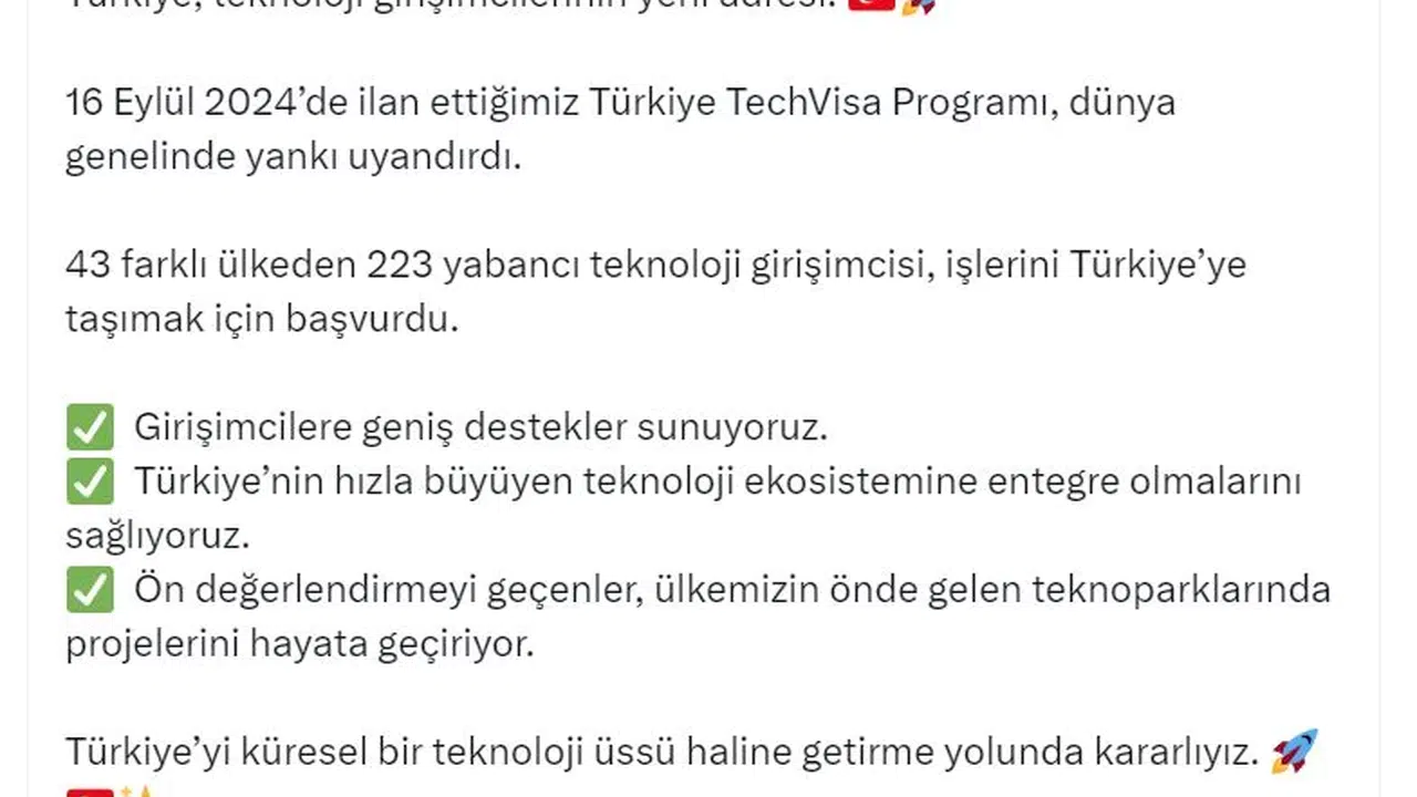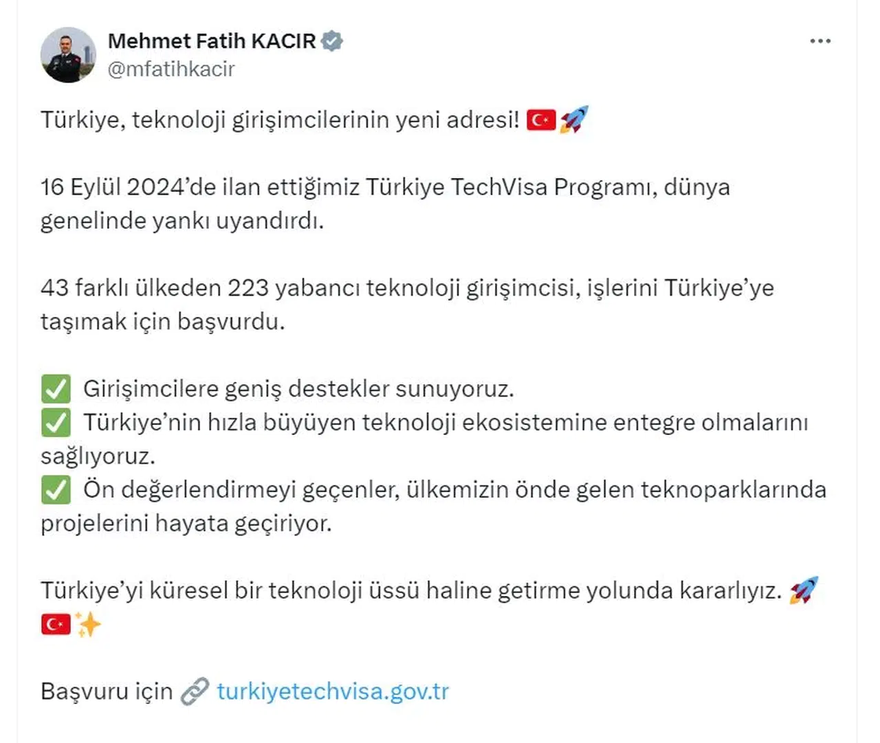ANKARA, (DHA)- SANAYİ ve Teknoloji Bakanı Mehmet Fatih Kacır, "6 Eylül 2024'te ilan ettiğimiz Türkiye TechVisa Programı, dünya genelinde yankı uyandırdı. 43 farklı ülkeden 223 yabancı teknoloji girişimcisi, işlerini Türkiye'ye taşımak için başvurdu" dedi.