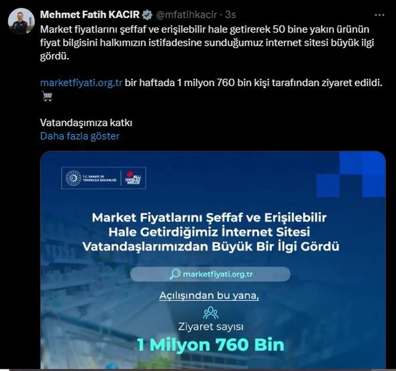 Bakan Kacır, sosyal medya hesabından yaptığı açıklamada "Market fiyatlarını şeffaf ve erişilebilir hale getirerek 50 bine yakın ürünün fiyat bilgisini halkımızın istifadesine sunduğumuz internet sitesi büyük ilgi gördü. 'http://marketfiyati.org.tr' bir haftada 1 milyon 760 bin kişi tarafından ziyaret edildi. Vatandaşımıza katkı sunacak dijital uygulamalar geliştirmeye devam edeceğiz" dedi. (DHA)