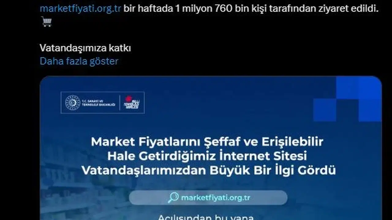 Gizem CENGİL/ANKARA, (DHA)- SANAYİ ve Teknoloji Bakanı Mehmet Fatih Kacır, market fiyatlarını şeffaf ve erişilebilir hale getirerek 50 bine yakın ürünün fiyat bilgisini halkın istifadesine sundukları internet sitesini 1 haftada 1 milyon 760 bin kişinin ziyaret ettiğini duyurdu.