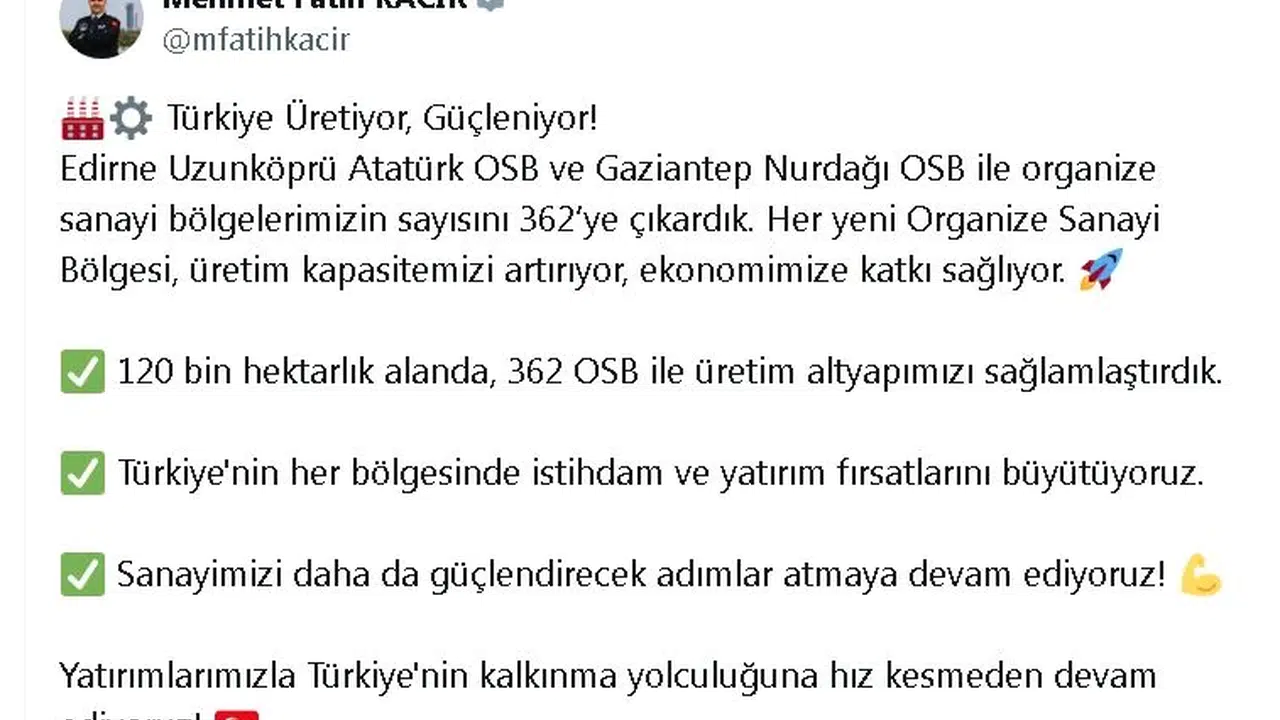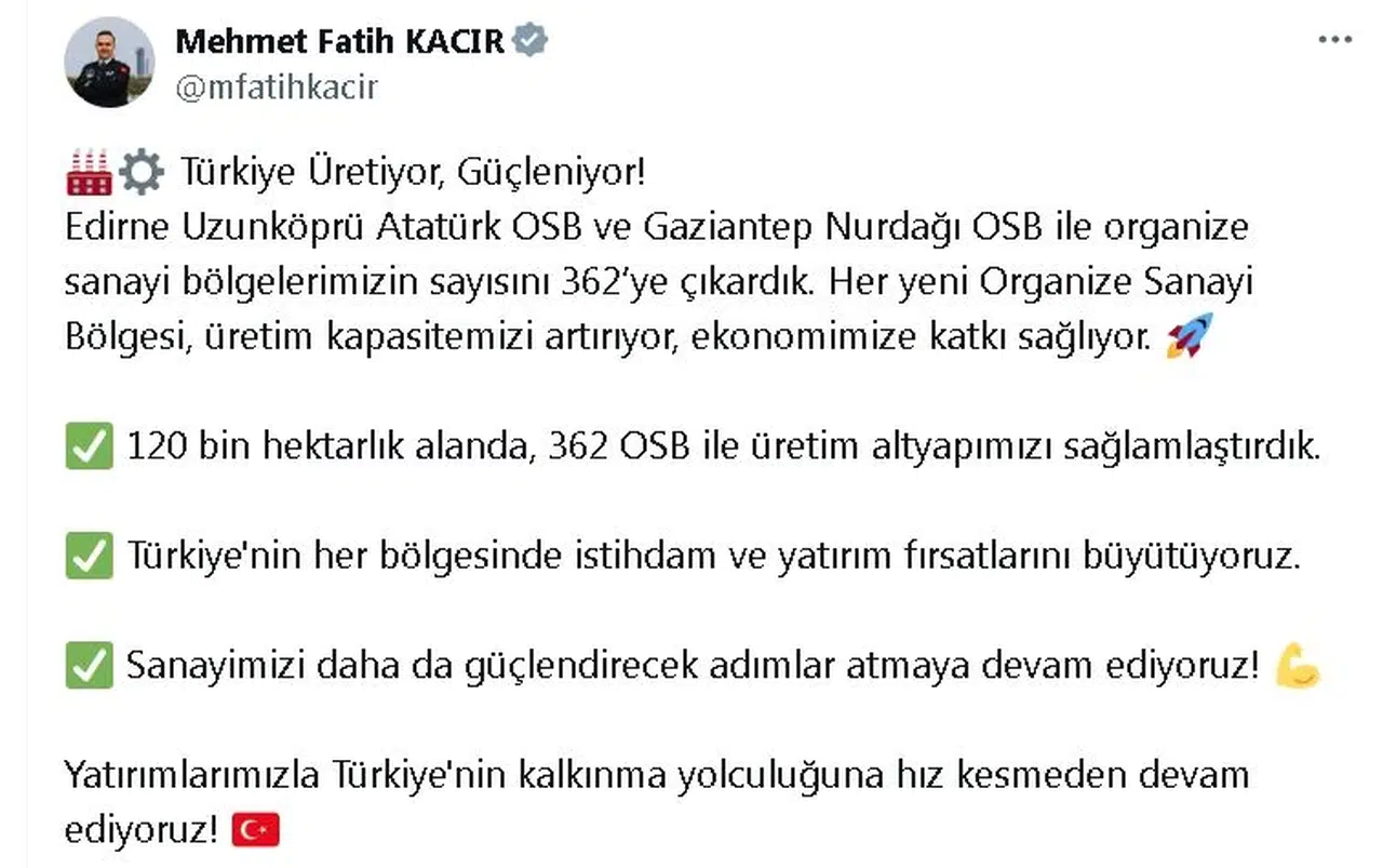 ANKARA, (DHA)- SANAYİ ve Teknoloji Bakanı Mehmet Fatih Kacır, "Edirne Uzunköprü Atatürk Organize Sanayi Bölgesi (OSB) ve Gaziantep Nurdağı OSB ile organize sanayi bölgelerimizin sayısını 362'ye çıkardık" dedi.