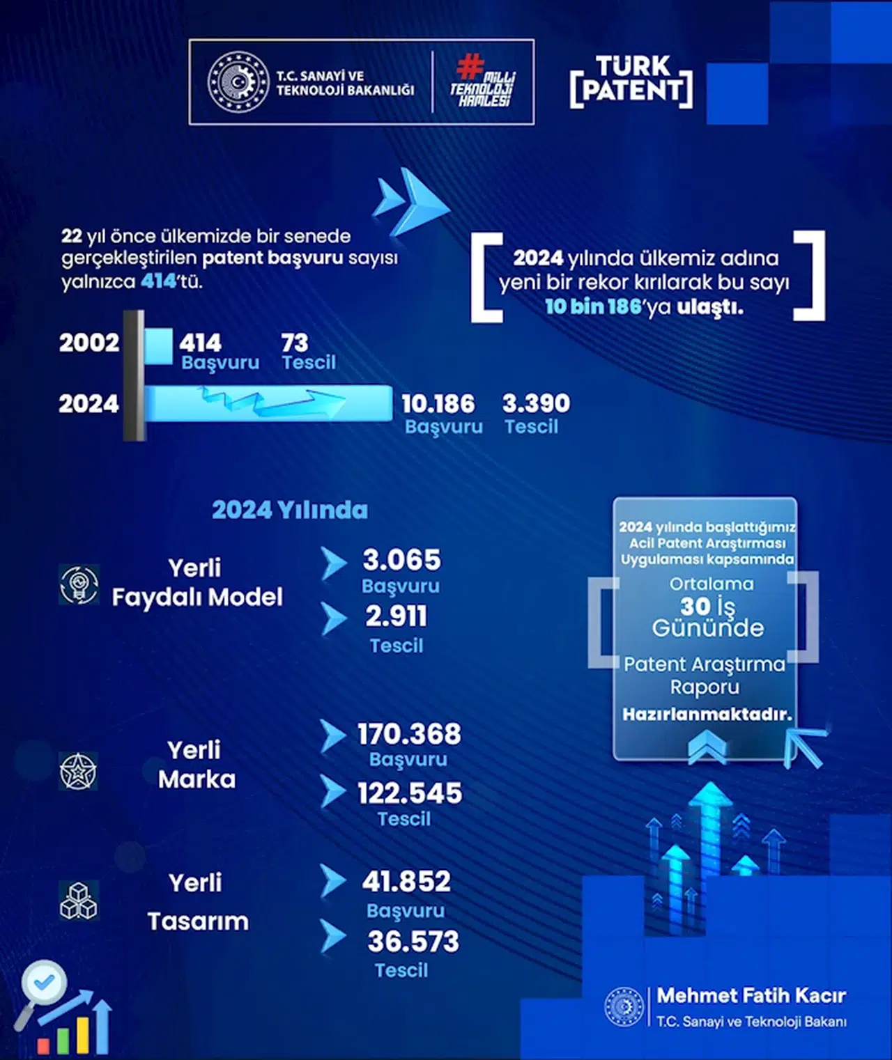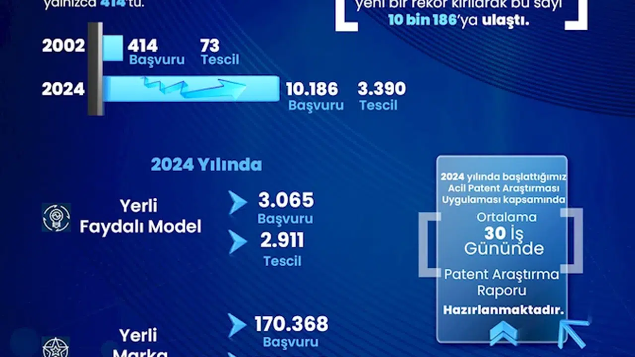 Bakan Kacır, sosyal medya hesabından yaptığı açıklamada, "Sınai mülkiyet portföyümüzü 22 yılda 93 binden 2 milyona çıkardık. Acil Patent Araştırması ile süreçleri hızlandırdık. Bu uygulamada patent araştırma raporu sürelerini 30 güne düşürdük. Patent tescil sürelerini kısalttık. 2002 yılında ülkemizde gerçekleştirilen patent başvuru sayısı yalnızca 414 iken, geçtiğimiz yıl bu sayı 10 bin 186'ya ulaştı. 2024 yılında 165 bin 585 yerli sınai mülkiyet hakkı tescil edildi. Ülkemizin Ar-Ge ve inovasyon ekosistemine güçlü altyapımızla destek vermeye, fikirlerin girişimlere ve ticari değere dönüşmesine katkı sağlamaya devam edeceğiz" ifadelerini kullandı. (DHA)