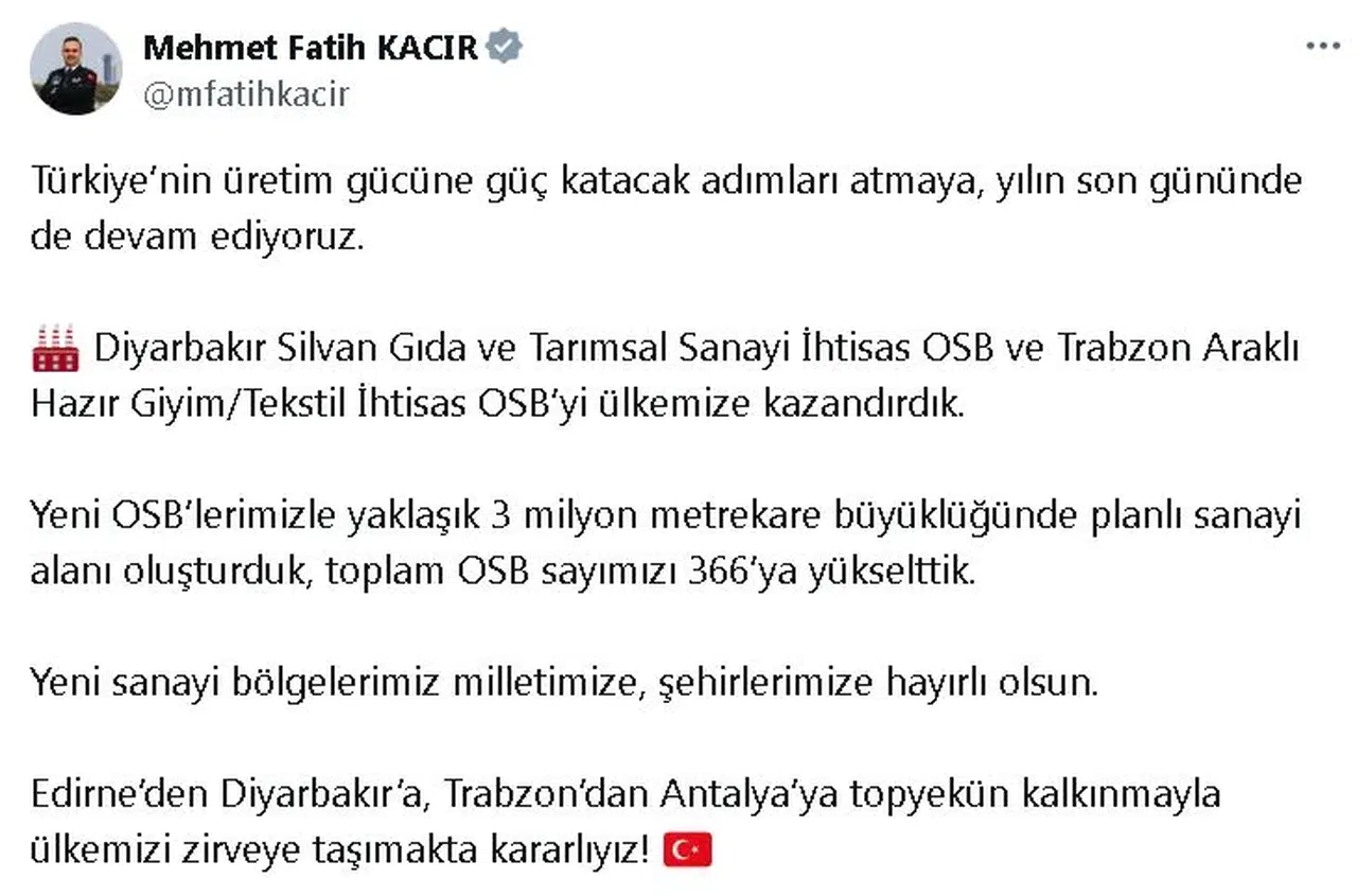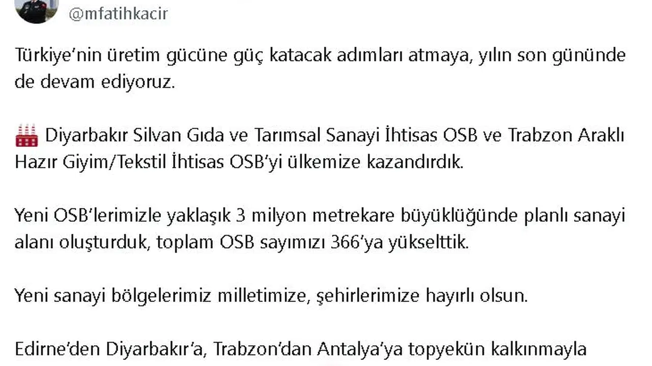 Bakan Kacır, sosyal medya hesabından yaptığı açıklamada, "Türkiye'nin üretim gücüne güç katacak adımları atmaya, yılın son gününde de devam ediyoruz. Diyarbakır Silvan Gıda ve Tarımsal Sanayi İhtisas OSB ve Trabzon Araklı Hazır Giyim/Tekstil İhtisas OSB'yi ülkemize kazandırdık. Yeni OSB'lerimizle yaklaşık 3 milyon metrekare büyüklüğünde planlı sanayi alanı oluşturduk, toplam OSB sayımızı 366'ya yükselttik. Yeni sanayi bölgelerimiz milletimize, şehirlerimize hayırlı olsun. Edirne'den Diyarbakır'a, Trabzon'dan Antalya'ya topyekün kalkınmayla ülkemizi zirveye taşımakta kararlıyız" ifadelerini kullandı. (DHA)