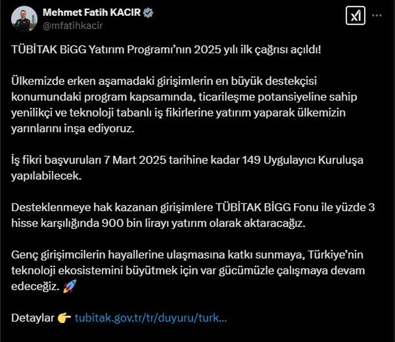 Gizem CENGİL/ANKARA, (DHA)- SANAYİ ve Teknoloji Bakanı Mehmet Fatih Kacır, Türkiye'nin ilk yatırım tabanlı girişimcilik destek programı olan TÜBİTAK BiGG Yatırım Programı'nın 2025 yılı ilk çağrısının başladığını açıkladı.