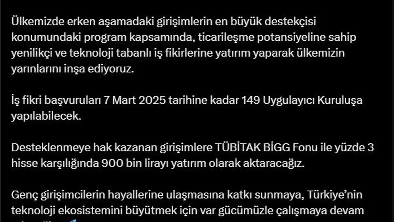 Bakan Mehmet Fatih Kacır, sosyal medya hesabından yaptığı açıklamada, "TÜBİTAK BiGG Yatırım Programı'nın 2025 yılı ilk çağrısı açıldı. Ülkemizde erken aşamadaki girişimlerin en büyük destekçisi konumundaki program kapsamında, ticarileşme potansiyeline sahip yenilikçi ve teknoloji tabanlı iş fikirlerine yatırım yaparak ülkemizin yarınlarını inşa ediyoruz. İş fikri başvuruları 7 Mart 2025 tarihine kadar 149 uygulayıcı kuruluşa yapılabilecek. Desteklenmeye hak kazanan girişimlere TÜBİTAK BİGG Fonu ile yüzde 3 hisse karşılığında 900 bin lirayı yatırım olarak aktaracağız. Genç girişimcilerin hayallerine ulaşmasına katkı sunmaya, Türkiye'nin teknoloji ekosistemini büyütmek için var gücümüzle çalışmaya devam edeceğiz" dedi. (DHA)