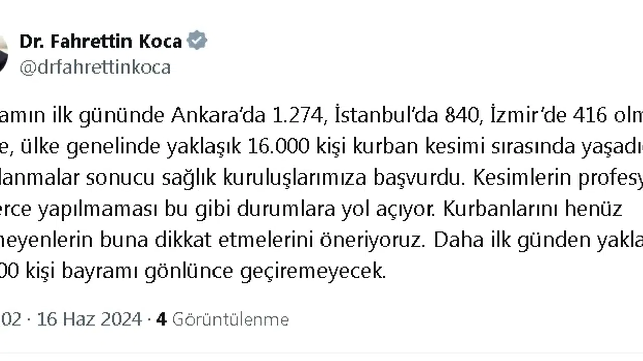 Sağlık Bakanı Fahrettin Koca, sosyal medya hesabından yaptığı paylaşımda, bayramın ilk gününde Ankara’da bin 274, İstanbul’da 840, İzmir’de 416 olmak üzere, ülke genelinde yaklaşık 16 bin kişinin kurban kesimi sırasında yaşadığı yaralanmalar sonucu sağlık kuruluşlarına başvurduğunu bildirdi.