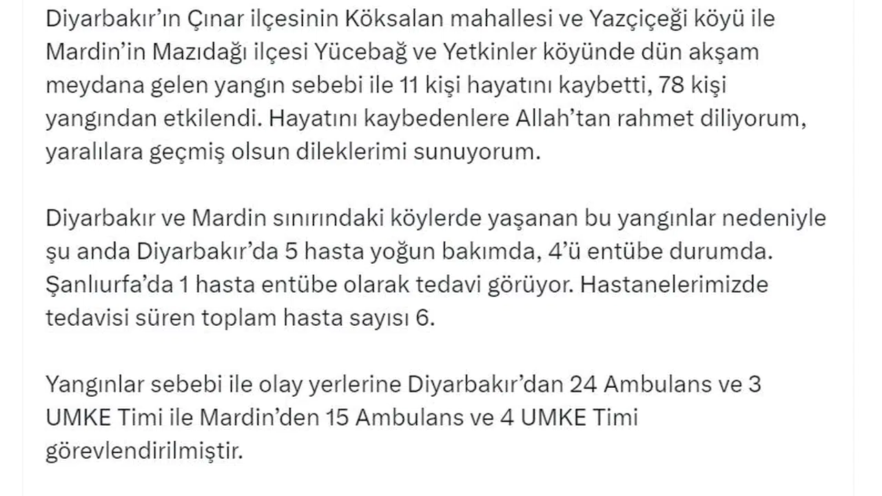 Bakan Koca, sosyal medya hesabından yaptığı açıklamada, "Diyarbakır'ın Çınar ilçesinin Köksalan Mahallesi ve Yazçiçeği köyü ile Mardin'in Mazıdağı ilçesi Yücebağ ve Yetkinler köyünde dün akşam meydana gelen yangın sebebi ile 11 kişi hayatını kaybetti, 78 kişi yangından etkilendi. Hayatını kaybedenlere Allah'tan rahmet diliyorum, yaralılara geçmiş olsun dileklerimi sunuyorum. Diyarbakır ve Mardin sınırındaki köylerde yaşanan bu yangınlar nedeniyle şu anda Diyarbakır'da 5 hasta yoğun bakımda, 4'ü entübe durumda. Şanlıurfa'da 1 hasta entübe olarak tedavi görüyor. Hastanelerimizde tedavisi süren toplam hasta sayısı 6. Yangınlar sebebi ile olay yerlerine Diyarbakır'dan 24 ambulans ve 3 UMKE Timi ile Mardin'den 15 ambulans ve 4 UMKE Timi görevlendirilmiştir. Bilindiği gibi, yangınlar ilgili birimlerce söndürülmüş olup, soğutma çalışmaları devam ediyor" denildi. (DHA)