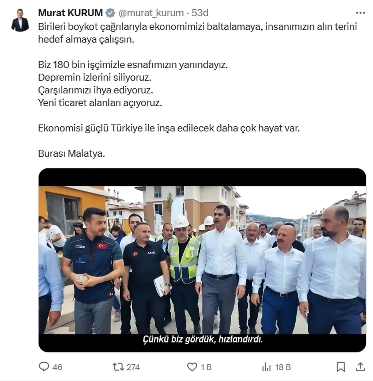 ANKARA, (DHA)- ÇEVRE, Şehircilik ve İklim Değişikliği Bakanı Murat Kurum, "Birileri boykot çağrılarıyla ekonomimizi baltalamaya, insanımızın alın terini hedef almaya çalışsın. Biz 180 bin işçimizle esnafımızın yanındayız" dedi.