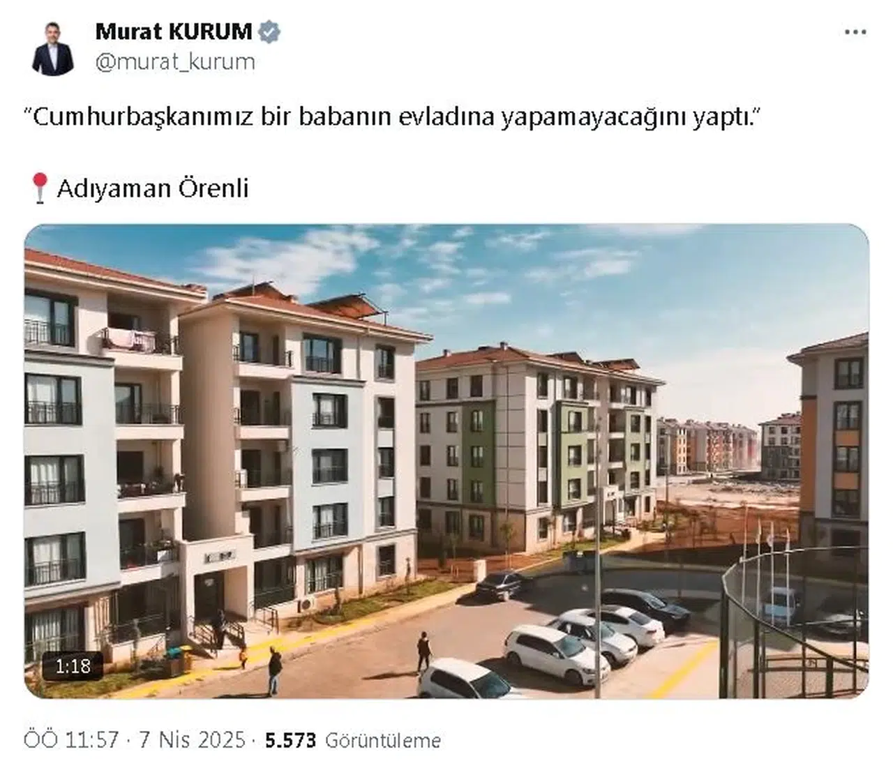 Çevre, Şehircilik ve İklim Değişikliği Bakanı Murat Kurum, sosyal medya hesabından Adıyamanlı depremzede Abdurrahman Parlak'ın 'Cumhurbaşkanımız bir babanın evladına yapamayacağını yaptı' sözlerini alıntılayarak, bölgeden görüntüler paylaştı. Kurum'un paylaştığı görüntülerde görüşlerine yer verilen Parlak, "Beklediğimizden kat kat iyisi oldu. Devletin güvencesi olmazsa millet yaşayamaz burada" dedi.