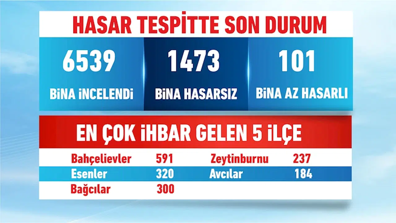 Çevre, Şehircilik ve İklim Değişikliği Bakanı Murat Kurum, katıldığı bir TV programında, İstanbul’da yaşanan 6,2’lik depreme dair değerlendirmelerde bulundu. Kurum, açıklamasında, “6 bin 539 bina hasarı ihbarı aldık. Bu binalardan 1473 binanın hasarsız, 101’i az hasarlı olarak tespit edildi. En çok hasar ihbar dağılımı sırasıyla; Bahçelievler, Esenler, Bağcılar, Zeytinburnu, Avcılar oldu. 6,2’lik deprem sonrası az hasar almış tüm vatandaşlarımızı Yarısı Bizden kampanyasına dahil edeceğiz. Vatandaşlarımız rıza gösteriyorsa bu dönüşüm sürecine onları dahil etmiş olacağız” ifadelerini kullandı. (DHA)