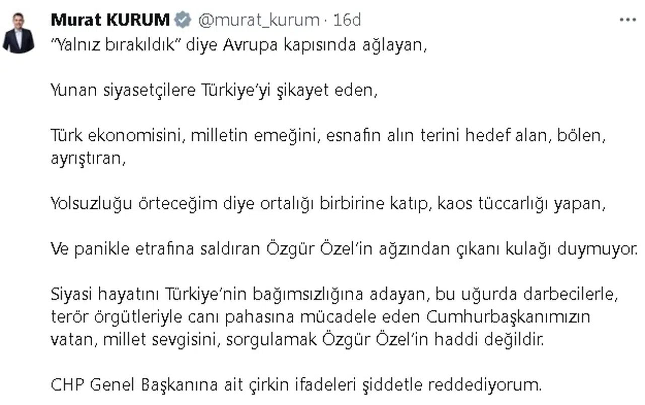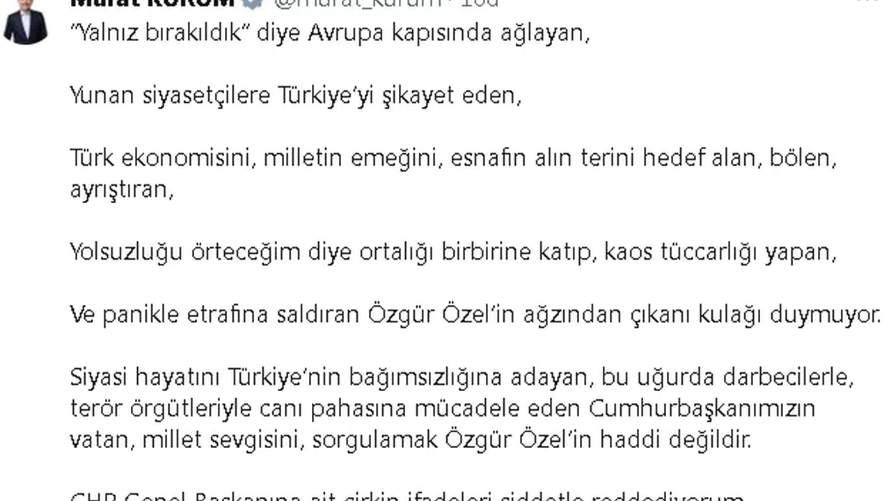 Bakan Kurum, sosyal medya hesabı üzerinden yaptığı paylaşımda, "'Yalnız bırakıldık' diye Avrupa kapısında ağlayan, Yunan siyasetçilere Türkiye’yi şikayet eden, Türk ekonomisini, milletin emeğini, esnafın alın terini hedef alan, bölen, ayrıştıran, yolsuzluğu örteceğim diye ortalığı birbirine katıp, kaos tüccarlığı yapan ve panikle etrafına saldıran Özgür Özel’in ağzından çıkanı kulağı duymuyor. Siyasi hayatını Türkiye’nin bağımsızlığına adayan, bu uğurda darbecilerle, terör örgütleriyle canı pahasına mücadele eden Cumhurbaşkanımızın vatan, millet sevgisini, sorgulamak Özgür Özel’in haddi değildir. CHP Genel Başkanına ait çirkin ifadeleri şiddetle reddediyorum" ifadelerini kullandı. (DHA)
