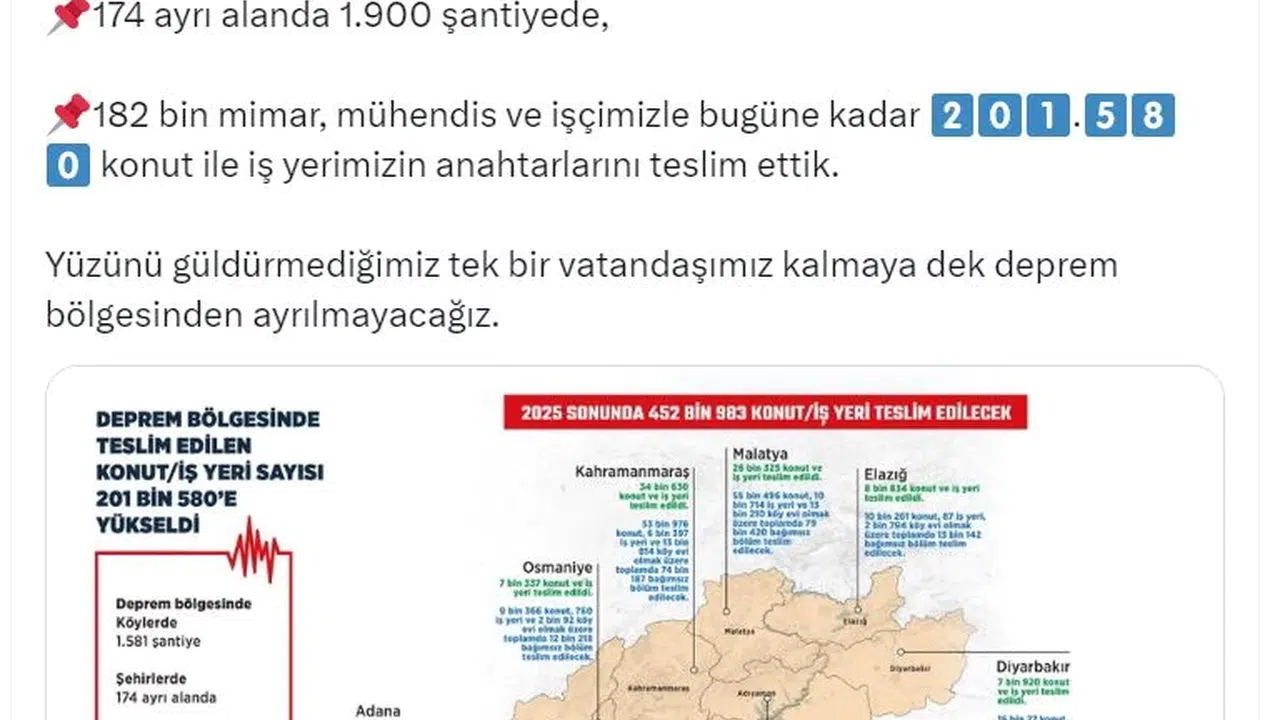 ANKARA, (DHA)- ÇEVRE, Şehircilik ve İklim Değişikliği Bakanı Murat Kurum, Kahramanmaraş merkezli 6 Şubat depremlerinin ardından 11 ilde 201 bin 580 konut ve iş yerinin vatandaşlara teslim edildiğini duyurdu.