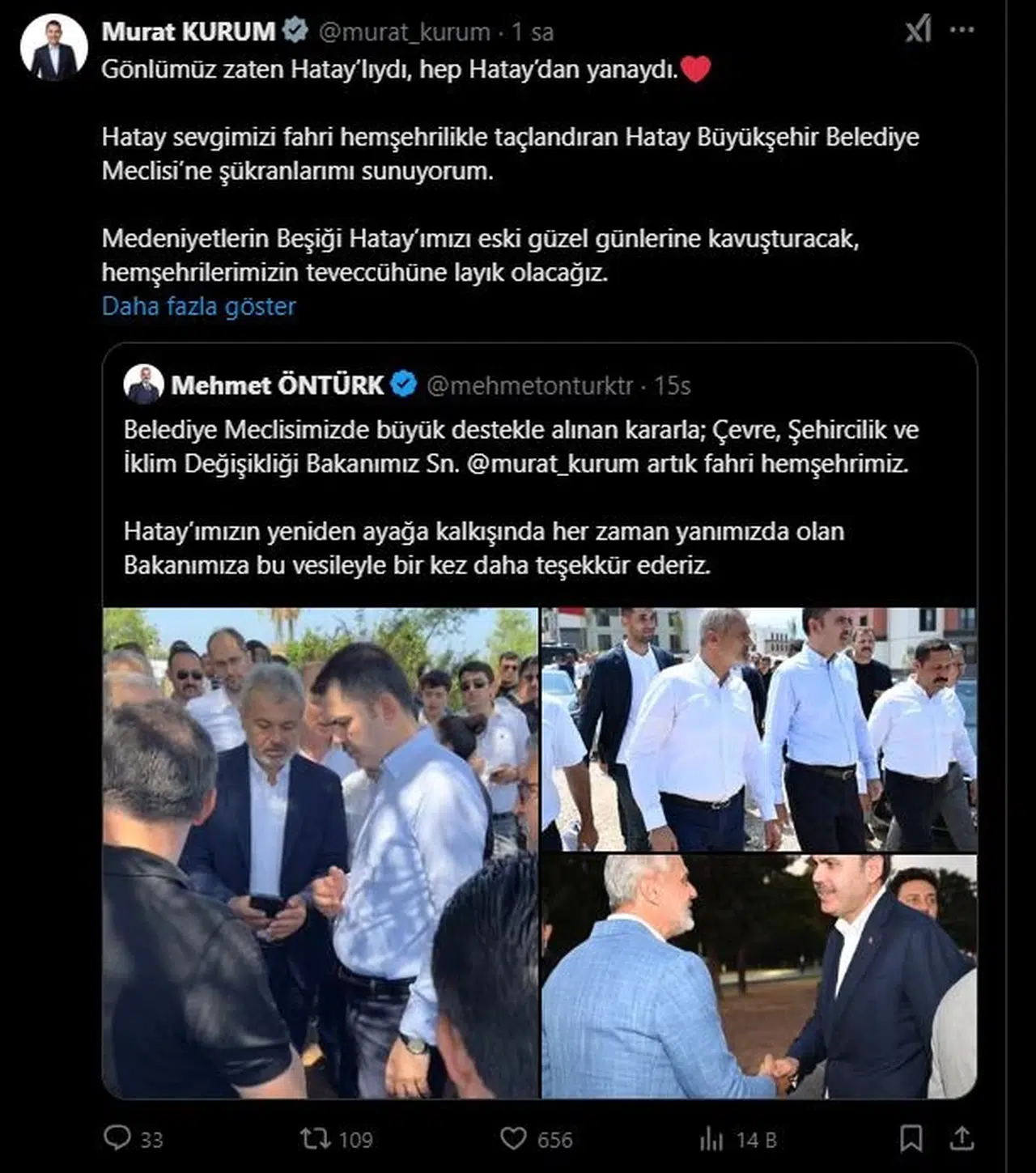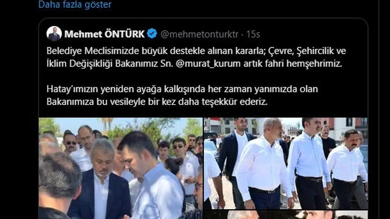 Hatay Büyükşehir Belediye Meclisi'nde, AK Parti grubunun, Çevre, Şehircilik ve İklim Değişikliği Bakanı Murat Kurum’a fahri hemşehrilik beratı verilmesini içeren önergesi kabul edildi. Hatay Büyükşehir Belediye Başkanı Mehmet Öntürk, sosyal medya hesabından yaptığı paylaşımda, "Belediye Meclisimizde büyük destekle alınan kararla; Çevre, Şehircilik ve İklim Değişikliği Bakanımız Sayın Murat Kurum artık fahri hemşehrimiz. Hatay’ımızın yeniden ayağa kalkışında her zaman yanımızda olan bakanımıza bu vesileyle bir kez daha teşekkür ederiz" dedi.