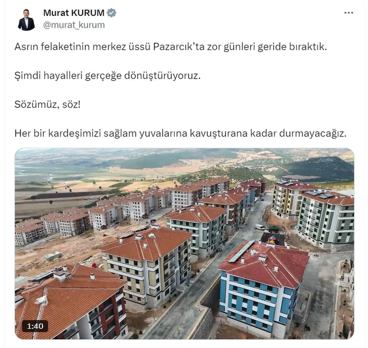 ANKARA, (DHA)- ÇEVRE, Şehircilik ve İklim Değişikliği Bakanı Murat Kurum, Kahramanmaraş'ın Pazarcık ilçesinde yapılan deprem konutlarının görüntülerini sosyal medya hesabından paylaşarak, "Her bir kardeşimizi sağlam yuvalarına kavuşturana kadar durmayacağız" dedi.