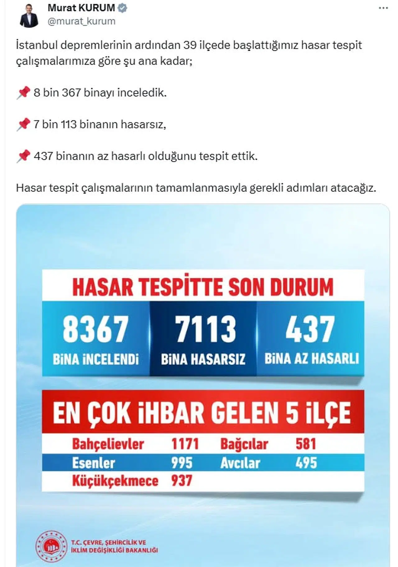 ANKARA, (DHA)-ÇEVRE, Şehircilik ve İklim Değişikliği Bakanı Murat Kurum, İstanbul'da 8 bin 367 binanın incelendiğini, bunlardan 437'sinin az hasarlı olduğunu duyurdu.