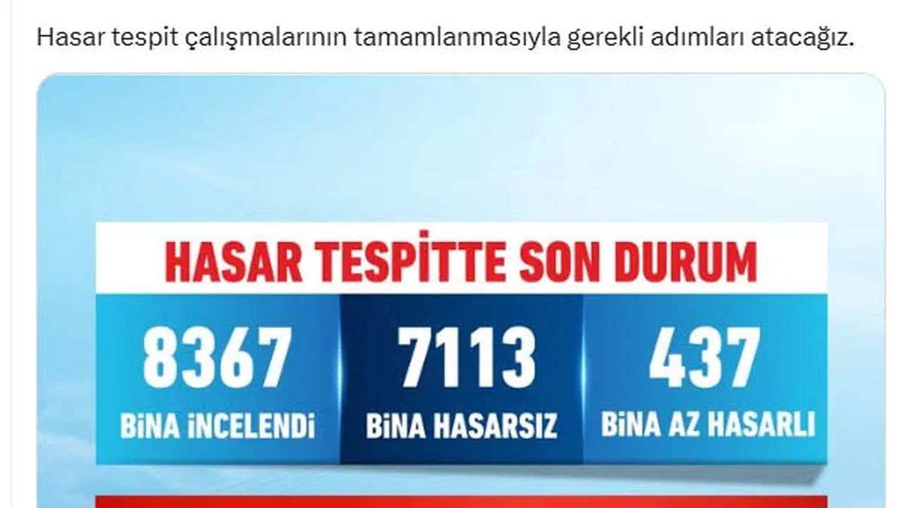 Bakan Kurum, sosyal medya hesabından yaptığı açıklamada, "İstanbul depremlerinin ardından 39 ilçede başlattığımız hasar tespit çalışmalarımıza göre şu ana kadar; 8 bin 367 binayı inceledik. 7 bin 113 binanın hasarsız, 437 binanın az hasarlı olduğunu tespit ettik. Hasar tespit çalışmalarının tamamlanmasıyla gerekli adımları atacağız" dedi. (DHA)